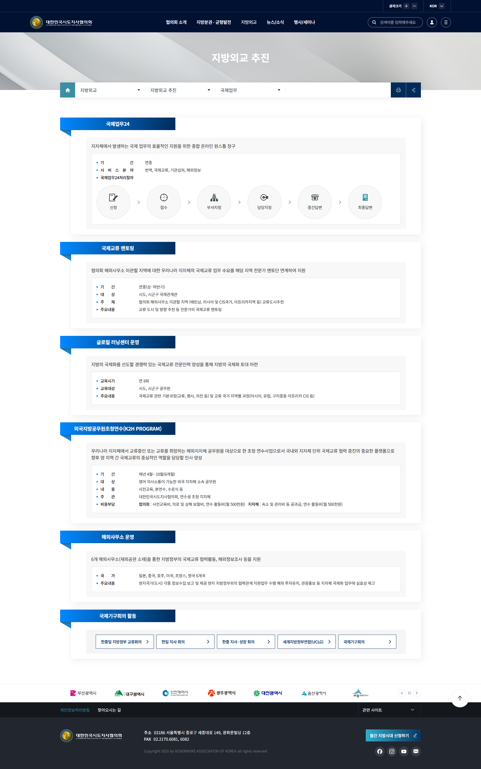 국제업무24·국제화정보 DB·국제기구회의 등 지방외교 전용 채널과 협의회 캘린더·시도지사정책콘퍼런스·월간 지방시대 구독 신청을 메인 허브로 통합하고, 페이스북·인스타그램·유튜브·네이버 블로그·카카오톡 SNS 채널 연동으로 정보 확산성과 대국민 접점을 강화하였습니다.