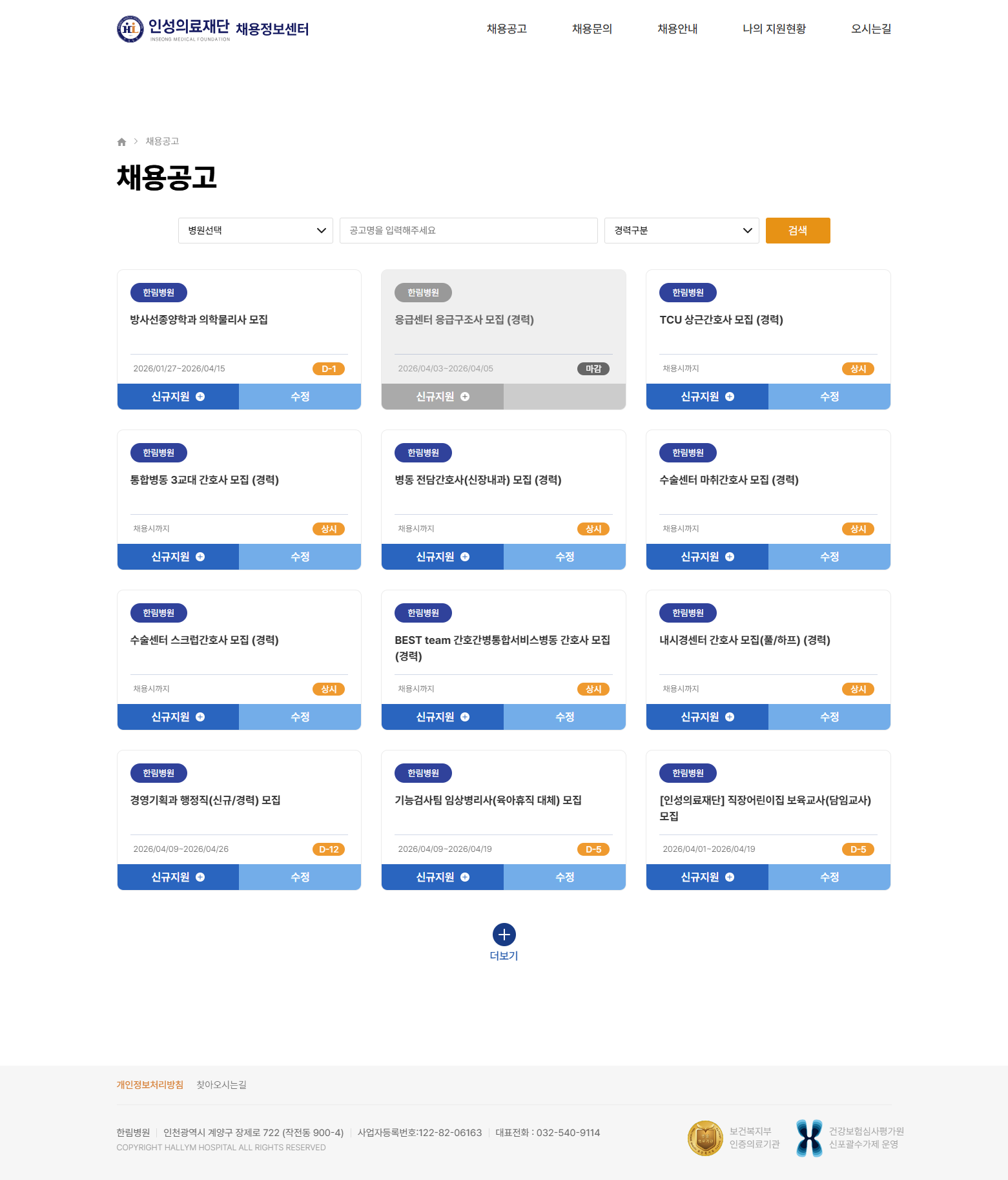 병원 탭과 경력구분 필터, 직무 키워드 검색을 결합한 채용공고 목록을 AJAX 더보기 방식으로 구성하여 4개 기관의 공고를 한 화면에서 빠르게 탐색할 수 있도록 하였습니다. -
