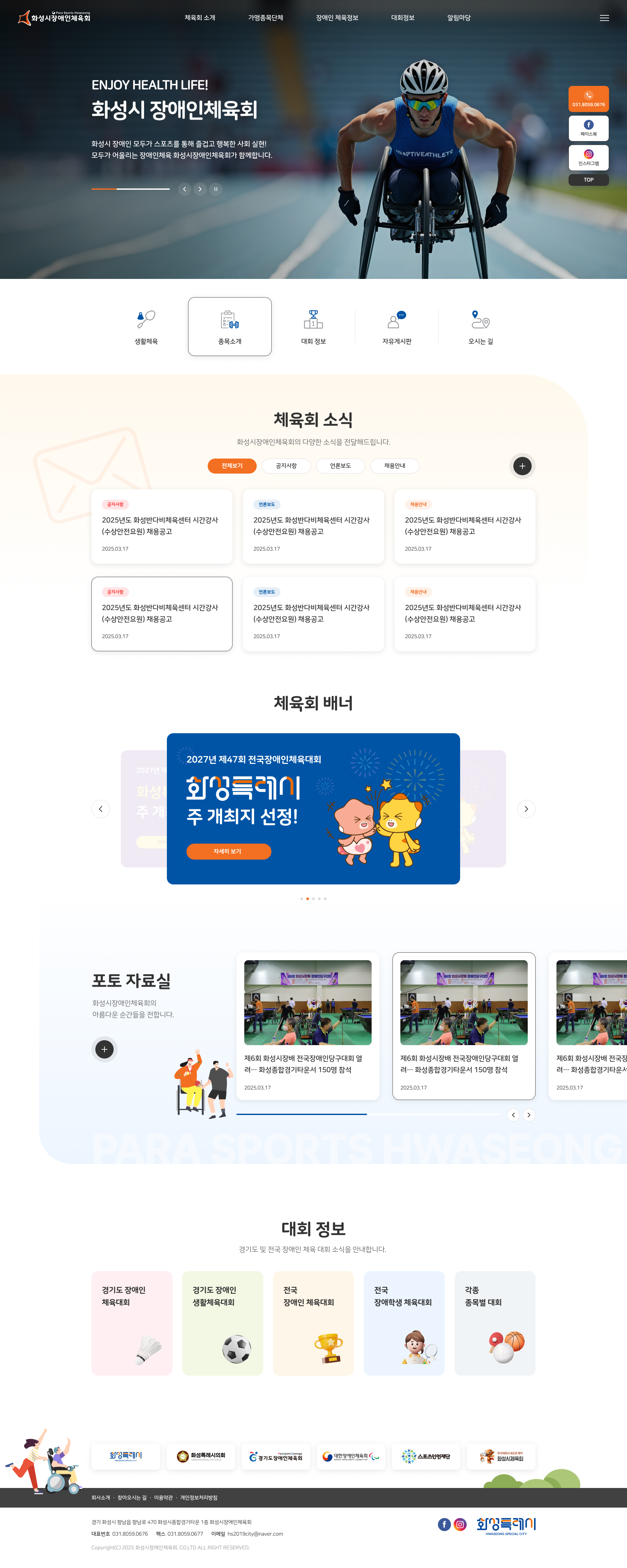 소식·자료실·대회정보 등을 카드형 UI로 구성해 가독성과 탐색 편의성을 강화했습니다.