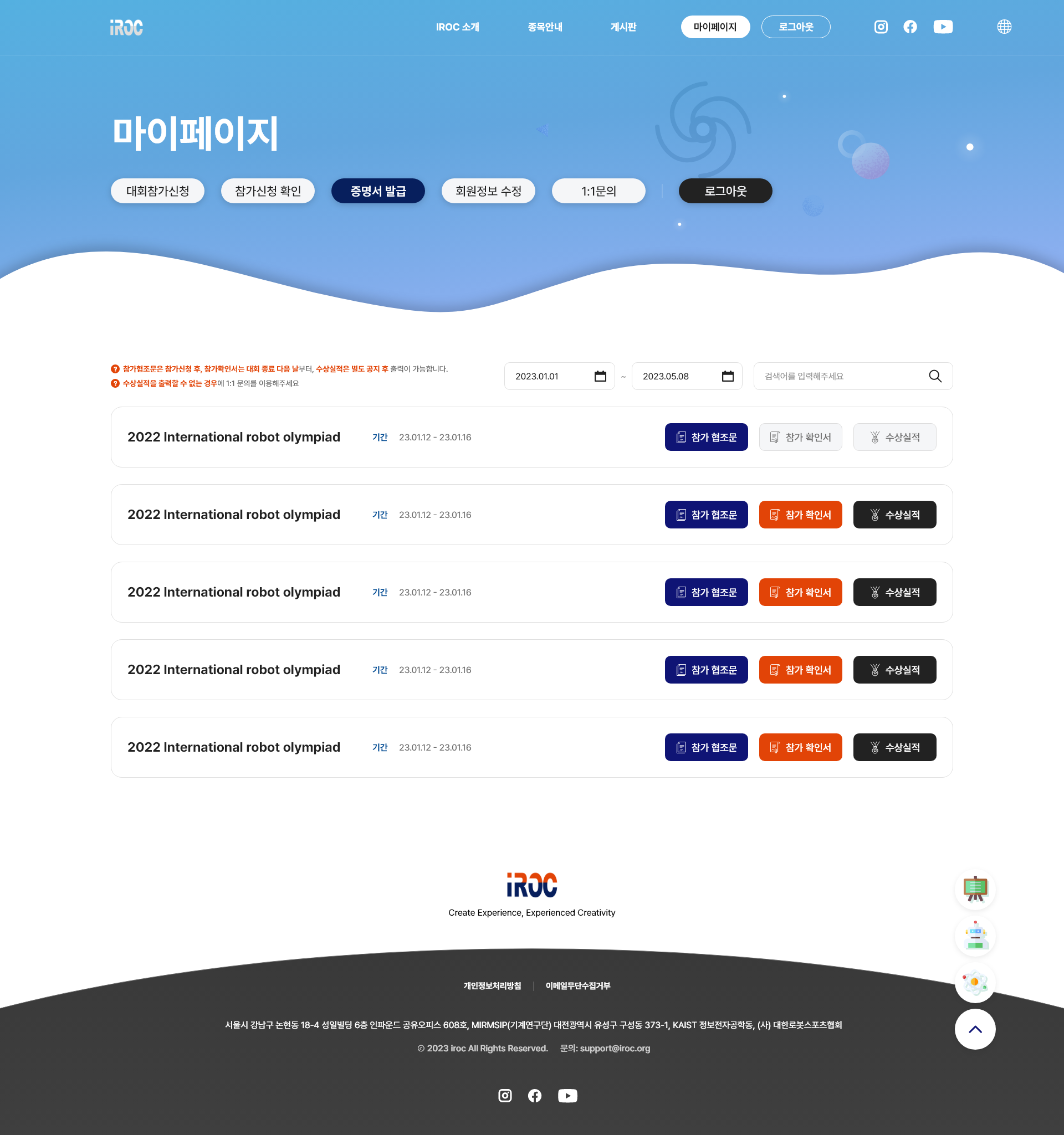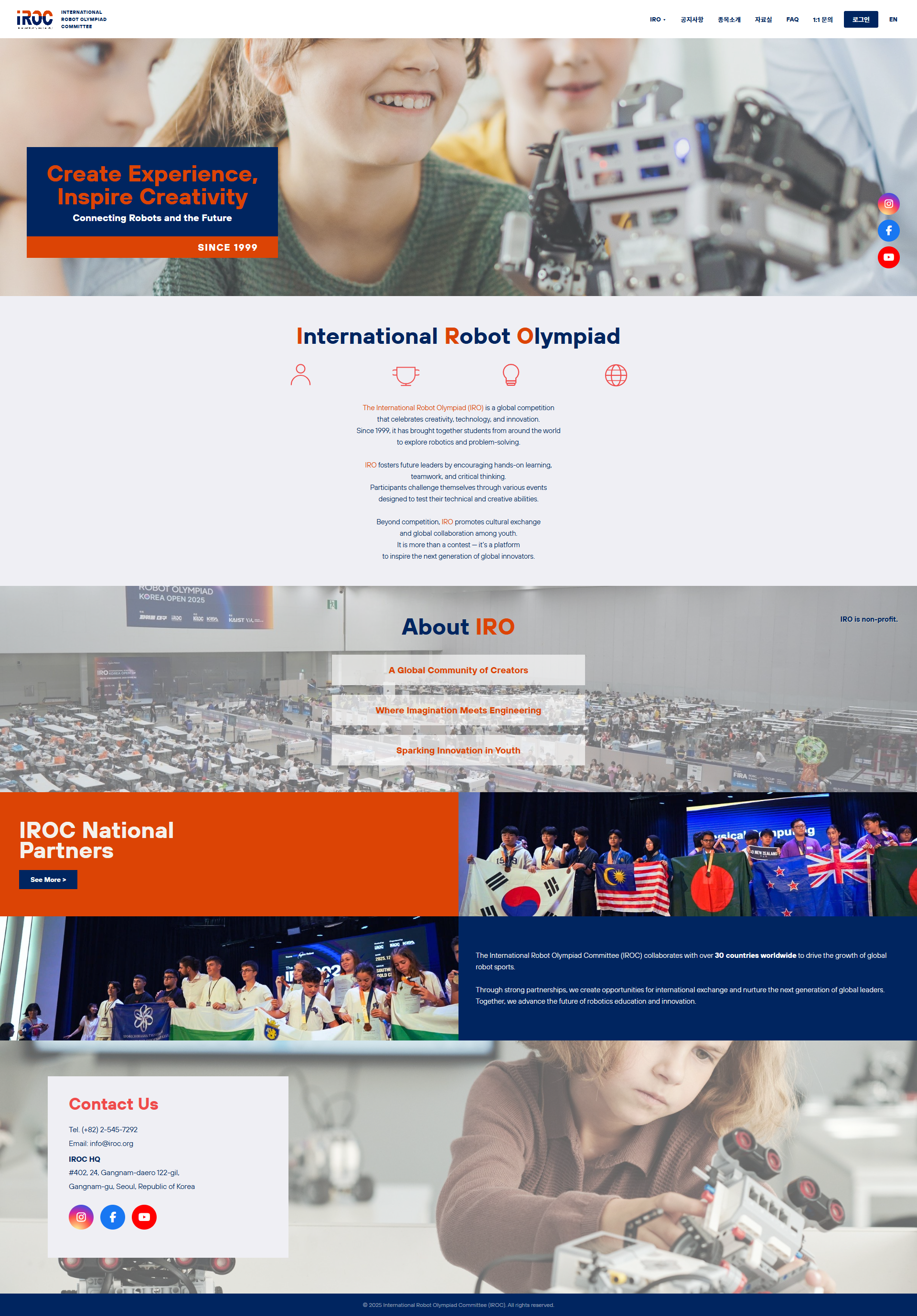 1999년부터 전 세계 학생들이 참가하는 국제로봇올림피아드(IRO)를 주관하는 비영리 국제기구 IROC은 30개 이상 국가의 내셔널 파트너와 협력하고 있으나, 대회 종목·규정·자료 안내가 체계적으로 제공되지 않아 참가자와 파트너 기관이 필요한 정보를 찾기 어려운 상황이었습니다.