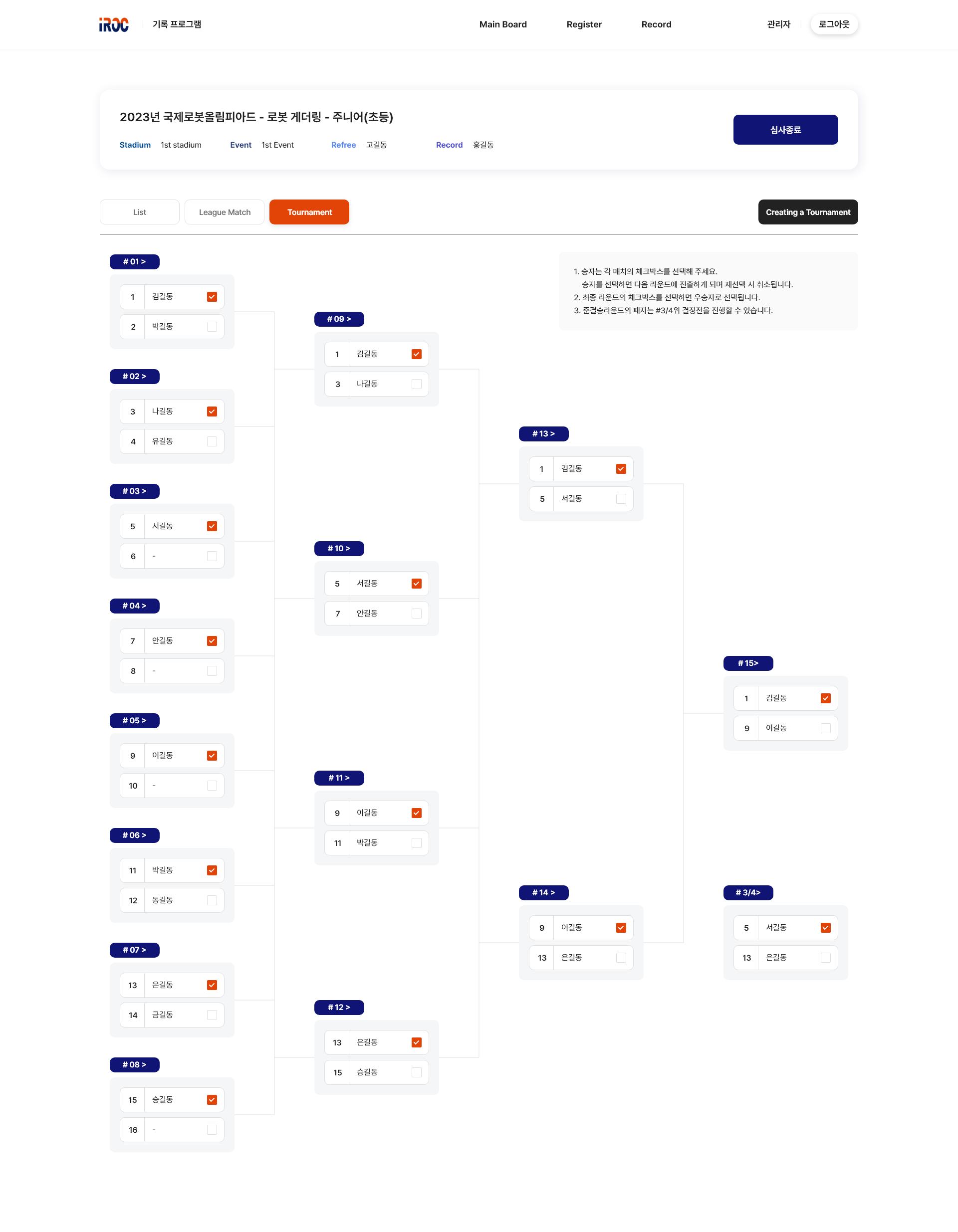 토너먼트 관리 시스템을 구축하여 참가팀 데이터를 기반으로 대진표를 자동 생성하고 경기 결과 입력 시 다음 라운드 대진이 즉시 업데이트되도록 하여 대회 운영 스태프의 수작업 부담을 줄이고 참가자가 실시간으로 대진 현황을 확인할 수 있도록 하였습니다. -