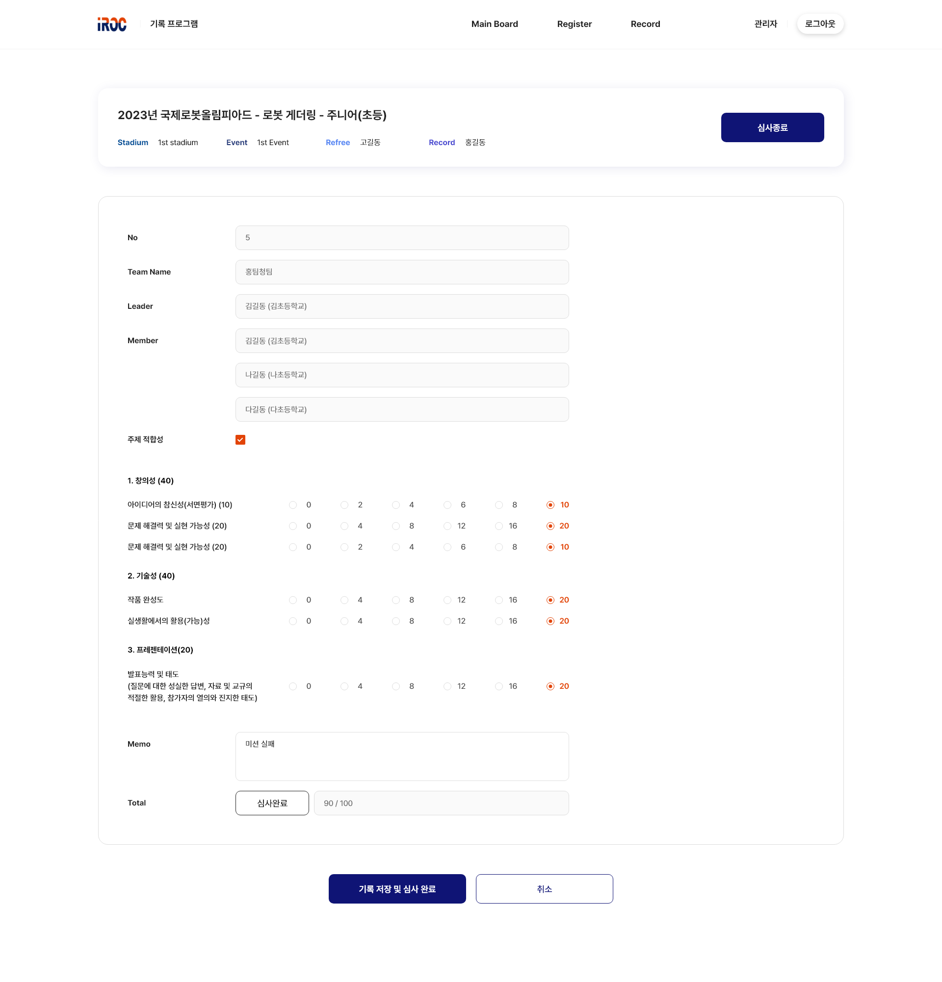 심사위원이 전용 프로그램에서 팀별 항목 점수를 입력하면 자동으로 집계·순위가 산출되는 심사 시스템을 구축하여 채점의 정확성과 투명성을 높이고, 결과 데이터를 토너먼트 시스템과 연동하여 경기 진행과 결과 처리가 즉시 이어지도록 하였습니다. -