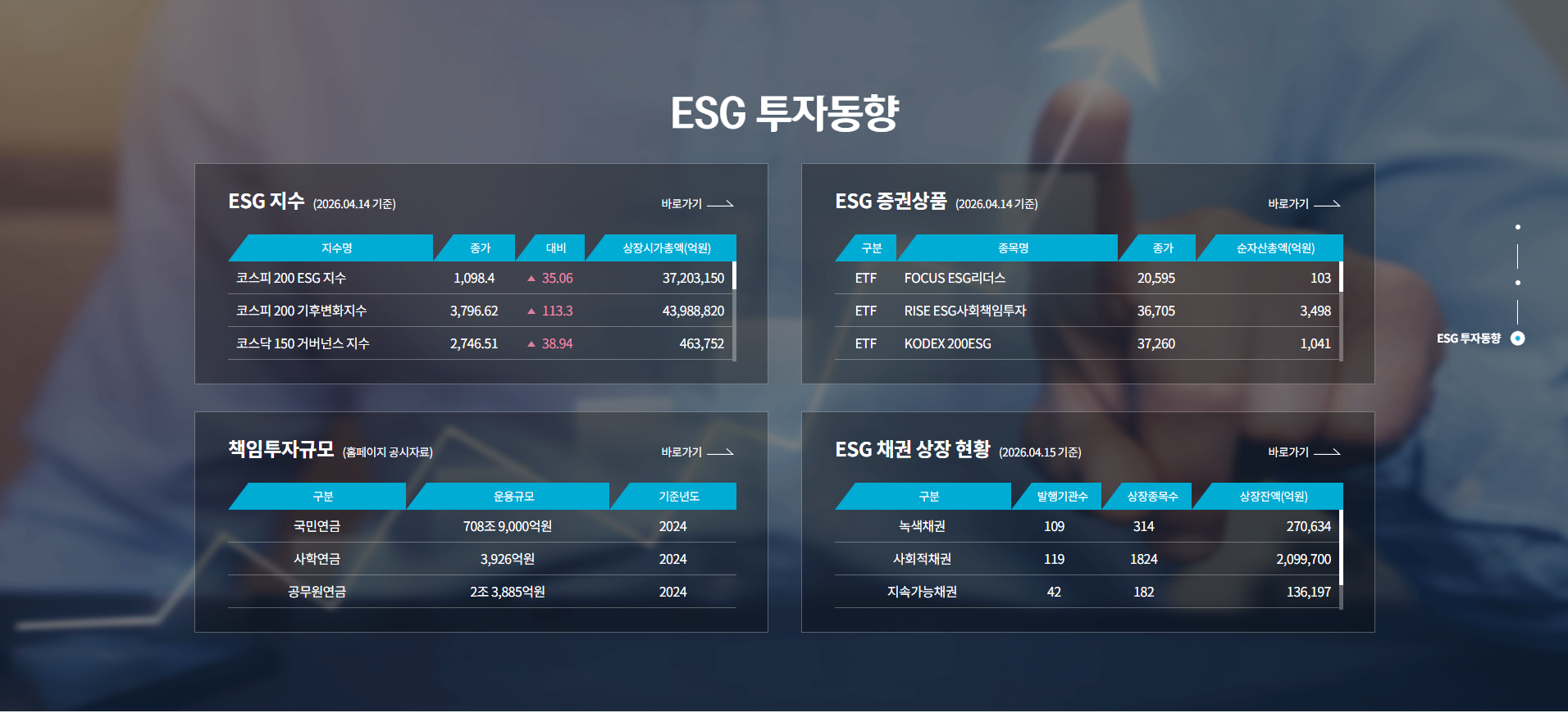 메인에 ESG 지수 실시간 시세와 ESG 증권상품 데이터를 슬라이더 형태로 노출하고, ESG 통계 메뉴에 국내 ESG 현황·펀드·채권현황·지수/증권상품을 통합 제공하여 ESG 자본시장 전반을 직관적으로 확인할 수 있도록 하였습니다. -