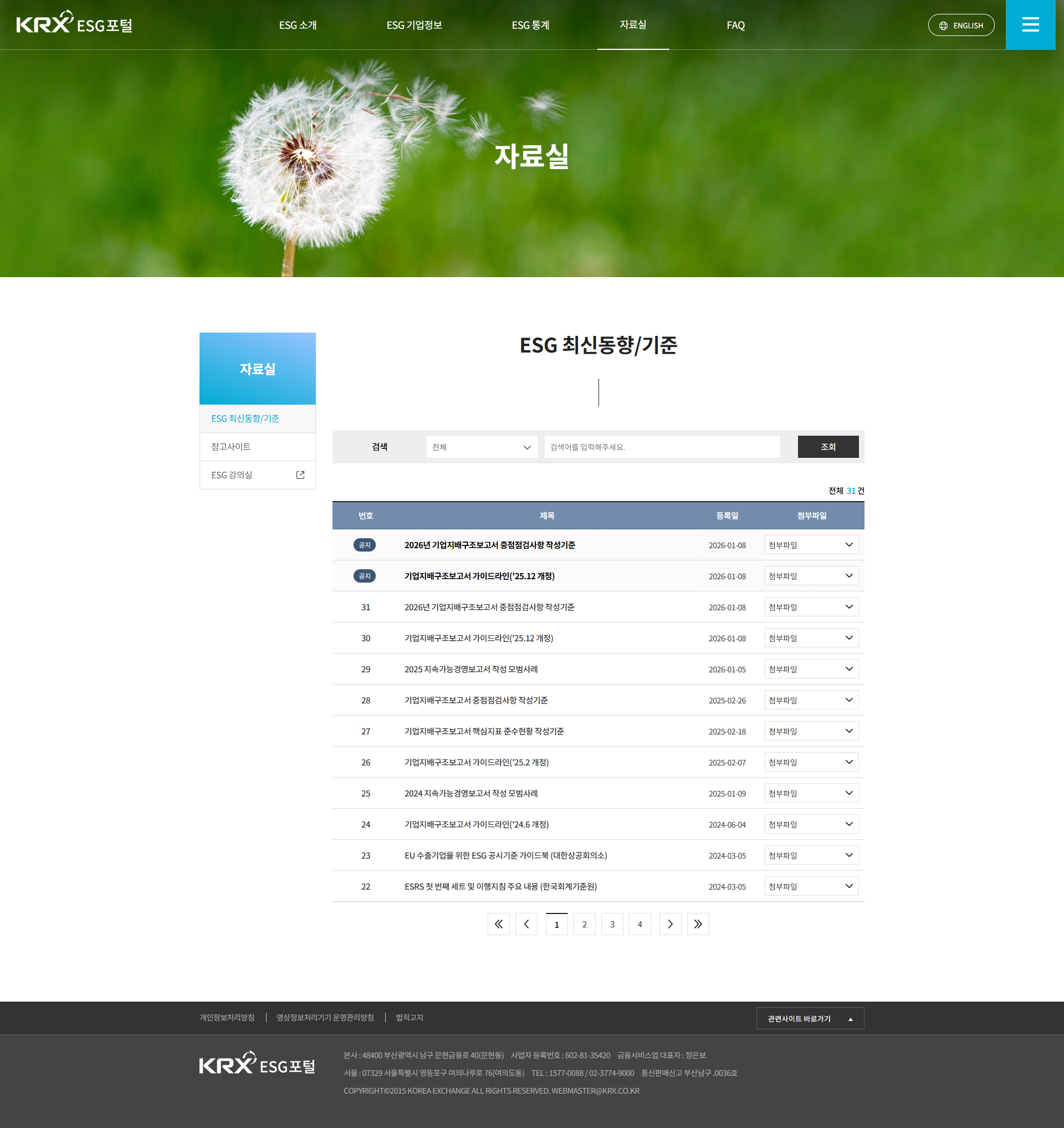 자료실 메뉴에 ESG 최신동향/기준, 참고사이트, ESG 강의실을 통합 구성하고 한국어·영어 이중 제공으로 국내외 이용자 모두를 위한 ESG 정보 허브 역할을 수행하도록 하였습니다.
