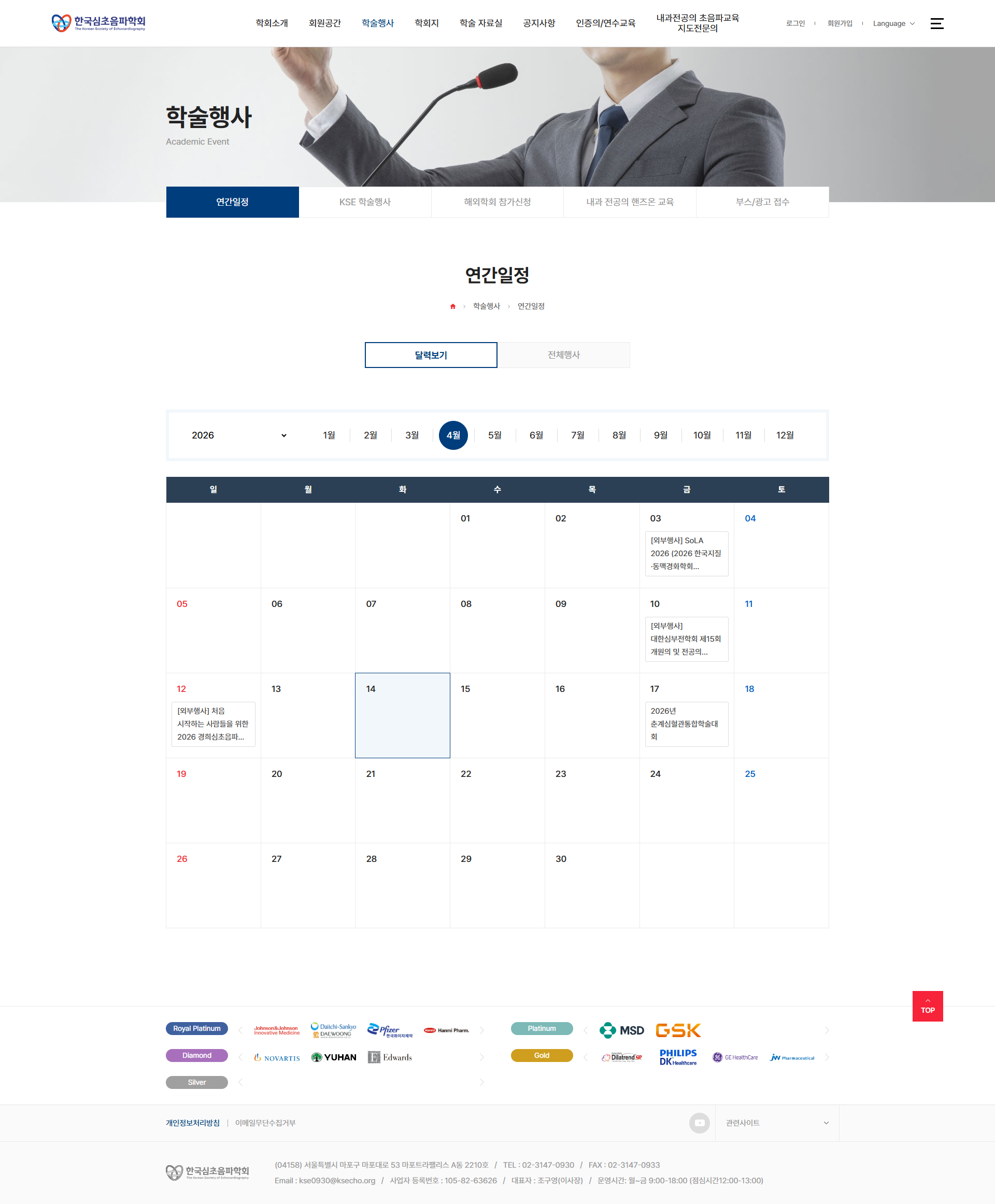 춘·추계 학술대회·KSE 웨비나·내과 전공의 핸즈온 교육·해외학회 참가지원 등 다양한 행사가 별도 공지로 분산되어 회원이 연간 행사 일정을 한눈에 파악하고 참가 신청까지 이어지기 어려웠습니다.