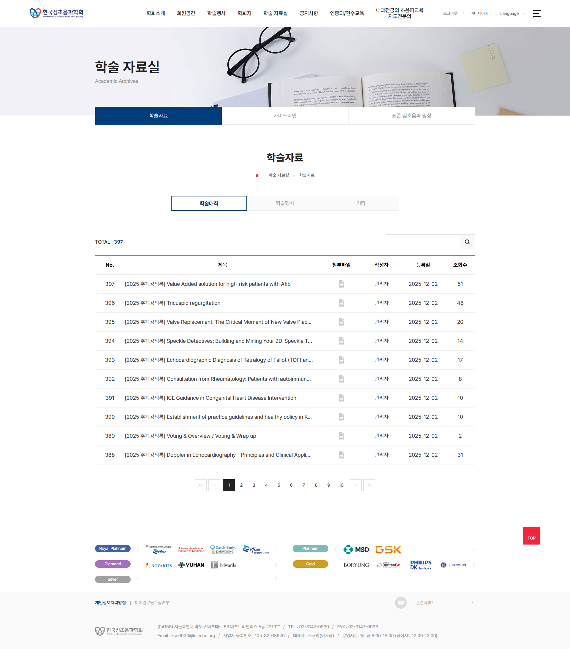 학술 자료실에 학술자료·가이드라인·표준 심초음파 영상을 통합 분류하고, KOR/ENG 언어 전환과 YouTube·카카오·네이버TV SNS 채널 연동을 통해 국내외 회원의 학술 정보 접근성을 강화하였습니다.