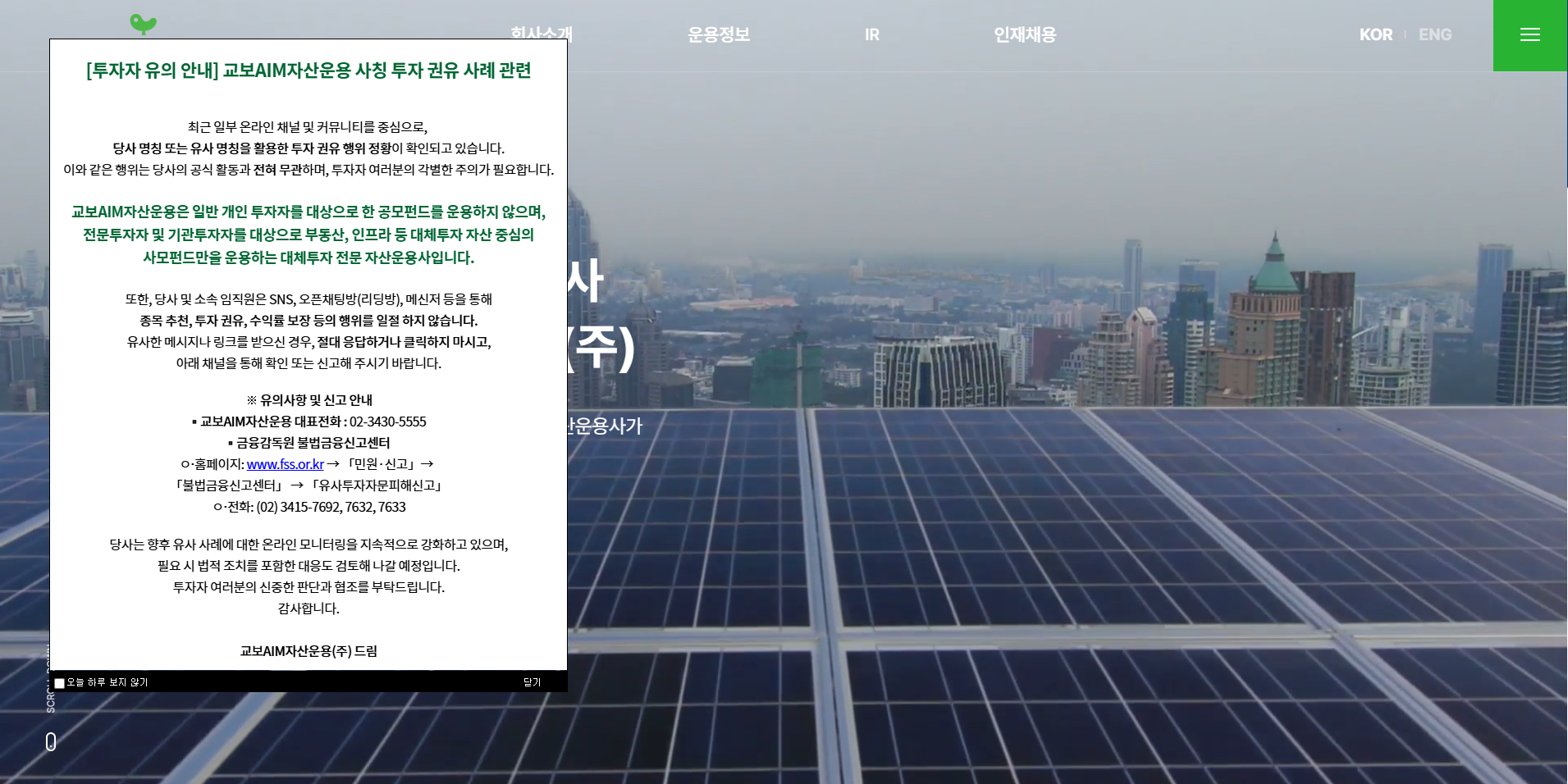 교보AIM자산운용 명칭을 사칭한 SNS·오픈채팅방을 통한 불법 투자 권유 사례가 발생하여 일반인의 피해와 브랜드 신뢰도 하락 우려가 컸으나, 홈페이지에 투자자 경보를 즉각 전달할 수 있는 안내 수단이 없었습니다.