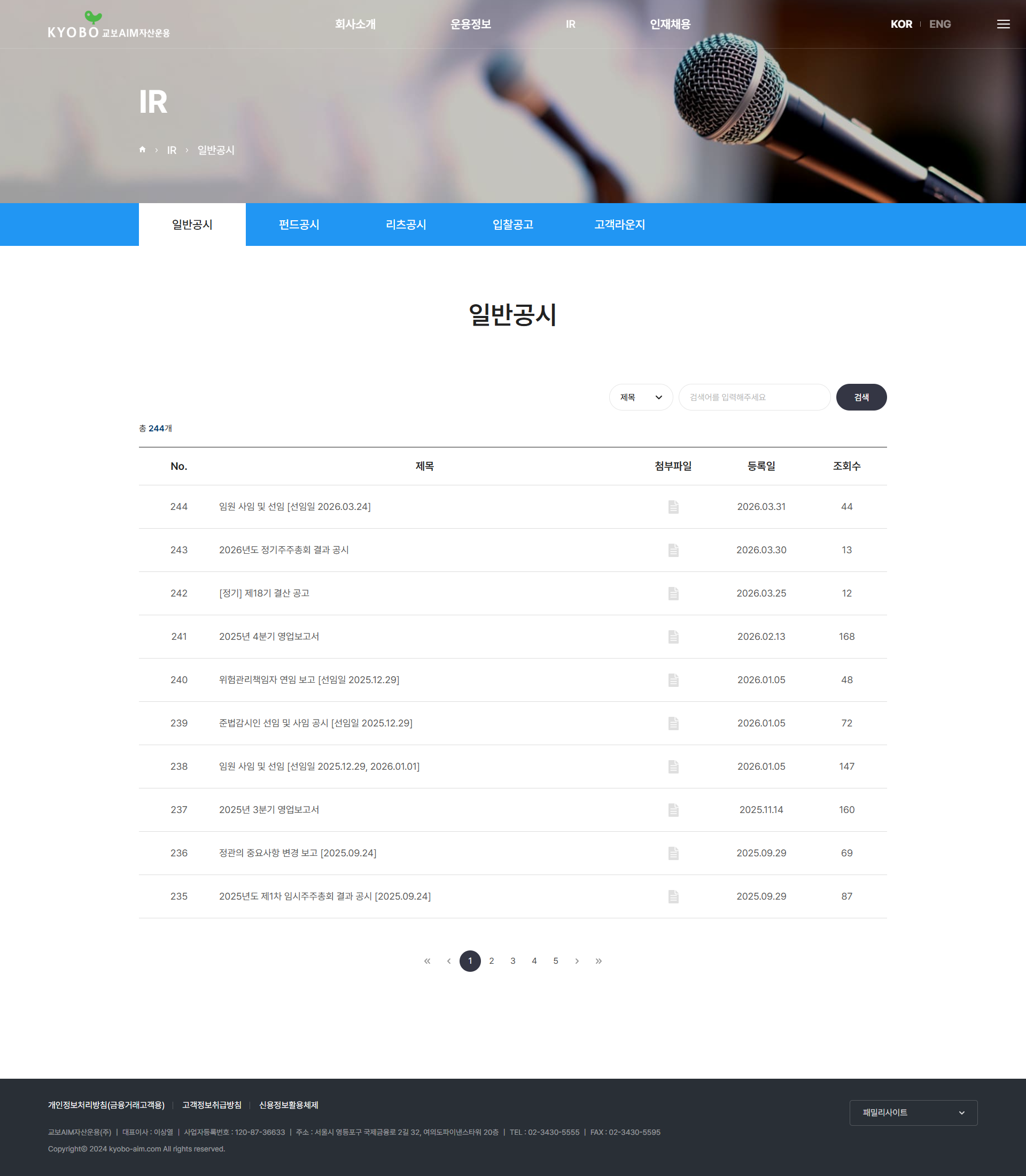 IR 전용 대메뉴에 일반공시·펀드공시·리츠공시·입찰공고를 유형별로 분리 구성하고 고객라운지(문의) 기능을 함께 배치하여 공시 접근성과 투자자 소통 창구를 강화하였습니다. -