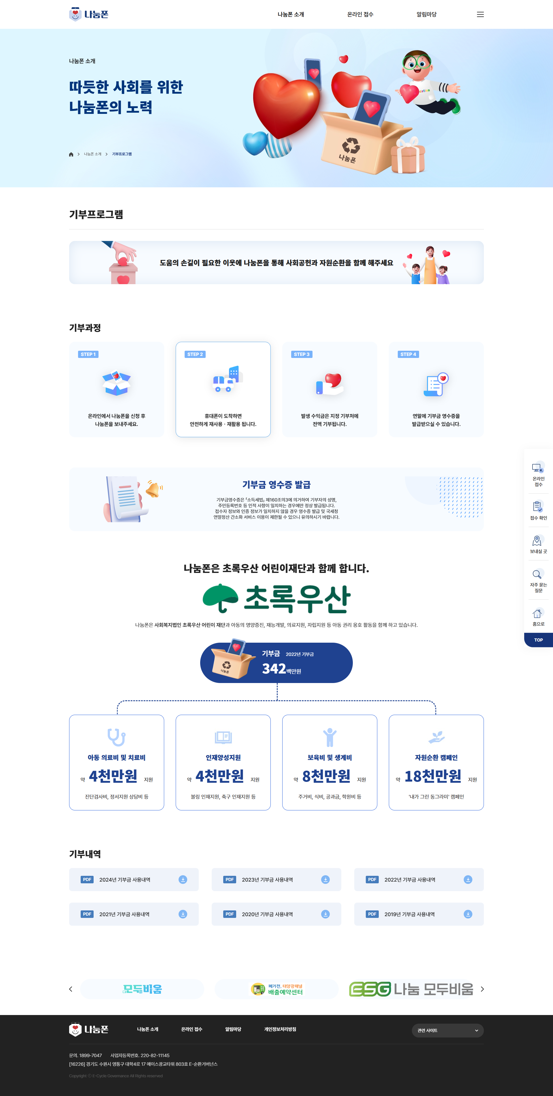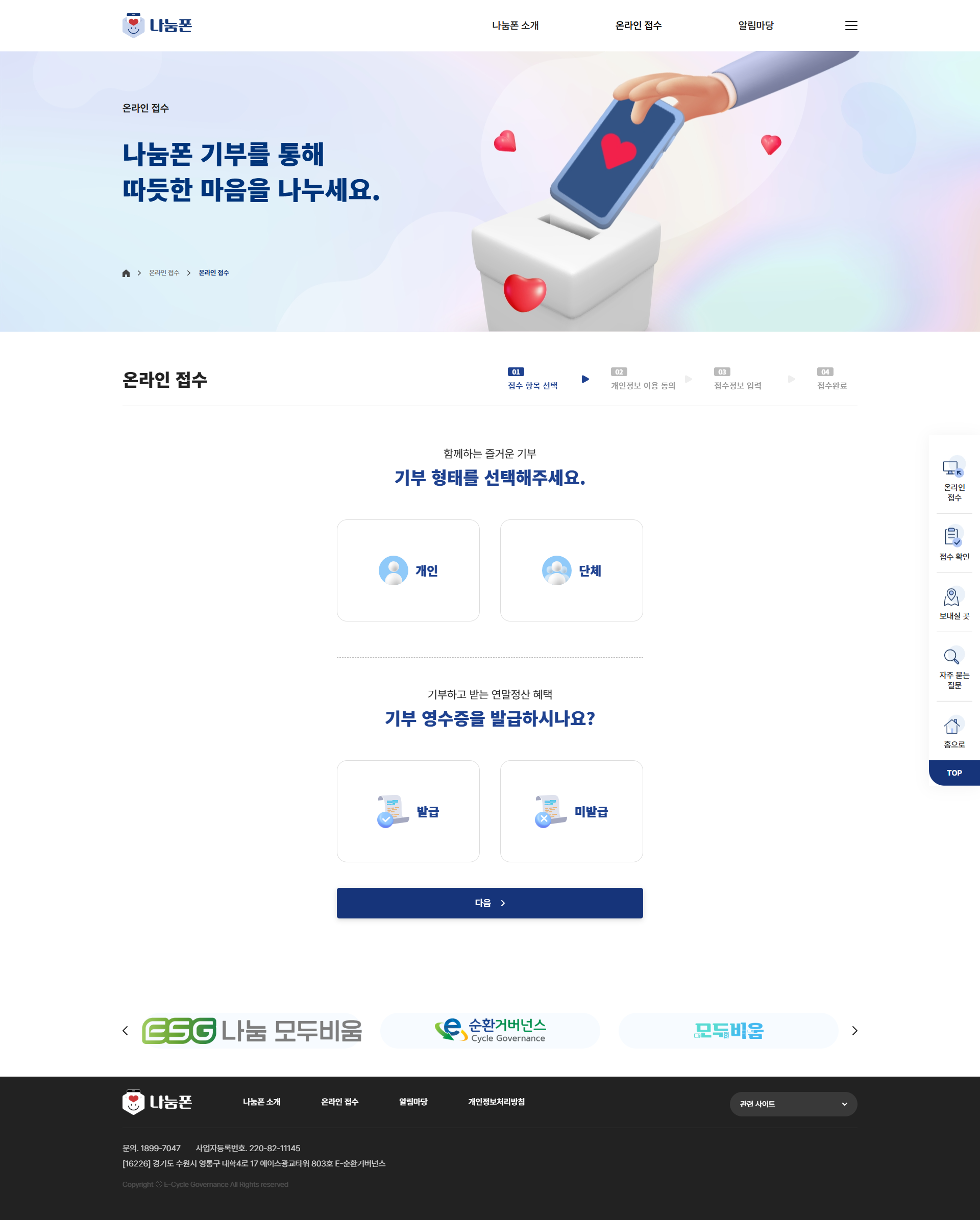 이를 해결하기 위해 온라인 기부 접수부터 기부금 영수증 발급까지 5단계 전 과정을 홈페이지에서 처리할 수 있는 시스템을 구축하였습니다.