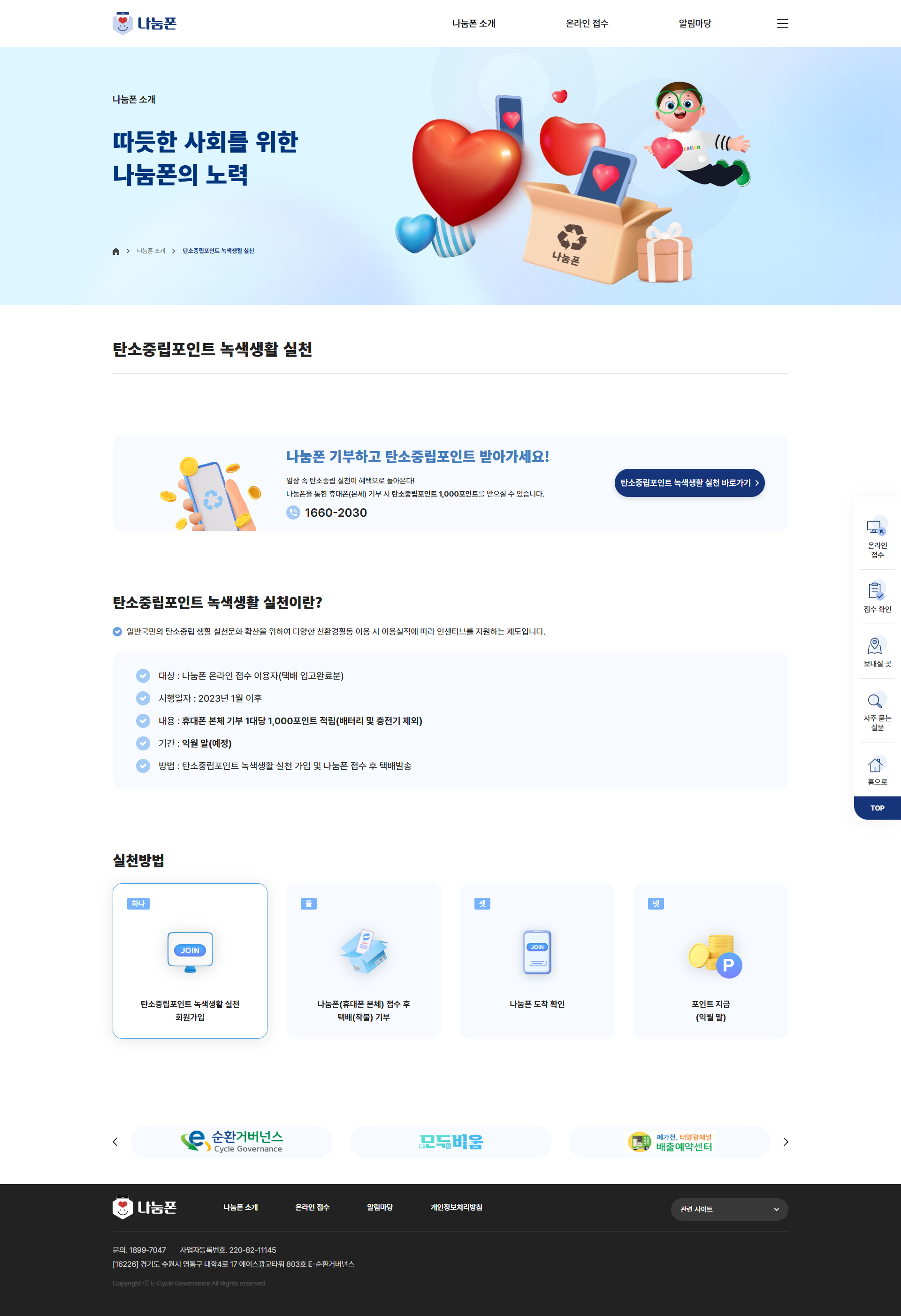탄소중립포인트 녹색생활실천 프로그램과 연계하고, 자원절약·자원순환 기여, 자연 생태계 보호, 개인정보유출방지, 유해물질 안전 처리 등 4가지 환경·사회적 가치를 아이콘 카드로 메인에 구성하여 나눔폰의 공익적 의미를 명확히 전달하였습니다.