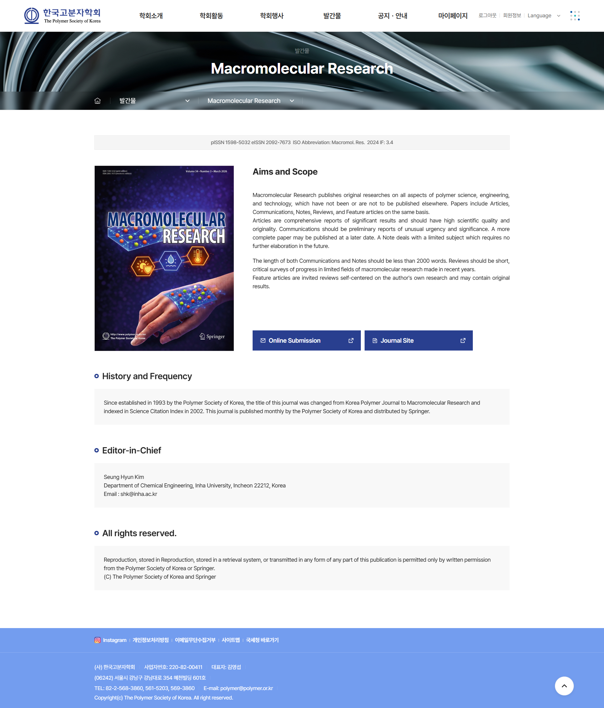 Macromolecular Research, Polymer(Korea), 고분자 과학과 기술 등 학술지 투고·열람 경로가 외부 시스템과 단절되어 회원 접근성이 낮았습니다. 각 학술지별 Online Submission과 Journal Site 링크를 발간물 섹션과 메인 최신 간행물 영역에 직접 연동하여 논문 투고부터 열람까지 홈페이지에서 즉시 연결할 수 있도록 하였습니다.