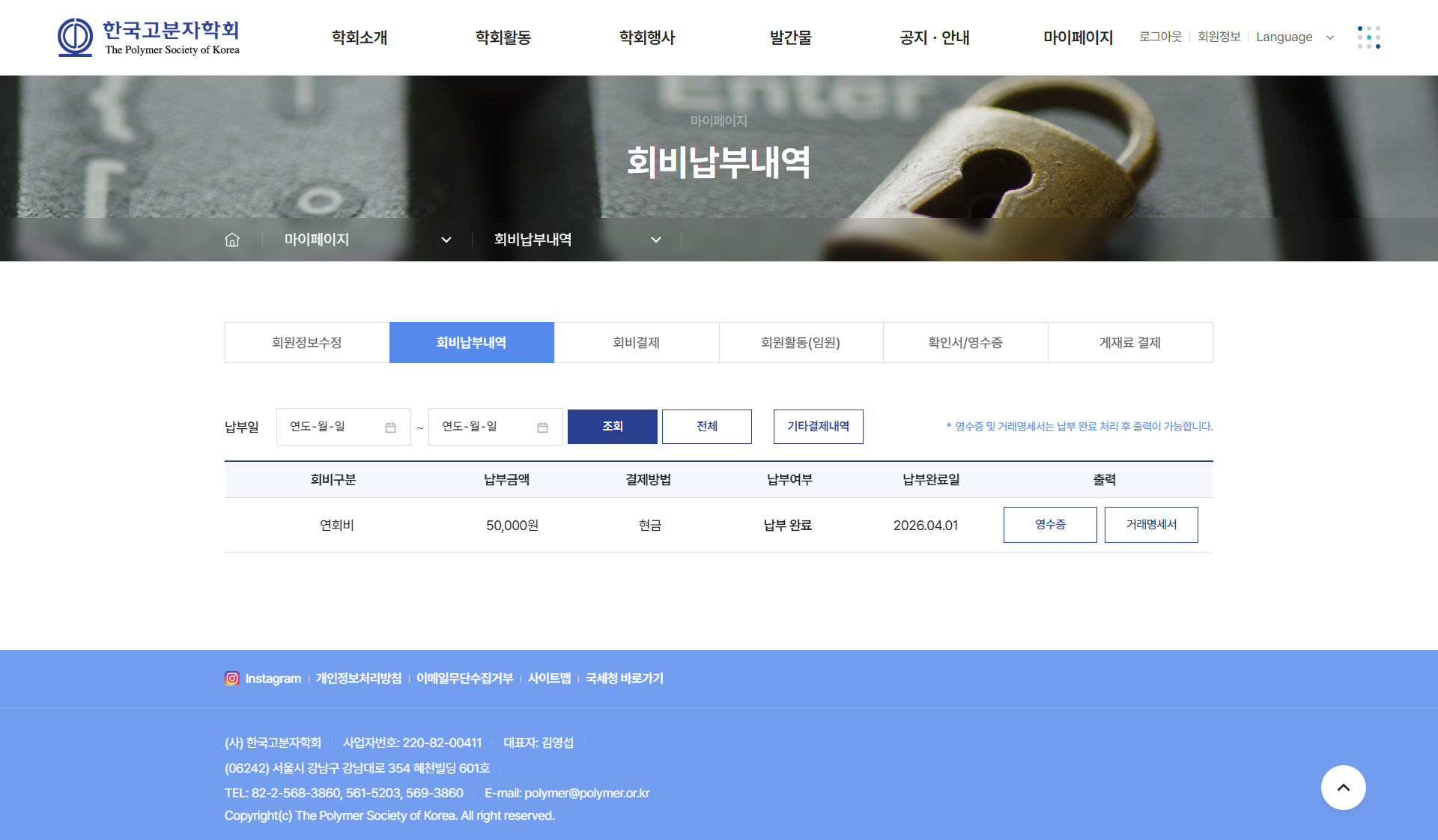 마이페이지 내에 회비결제·게재료 결제·회비납부내역·확인서/영수증·회원정보수정을 통합하여 로그인 후 한 곳에서 주요 행정 업무를 처리할 수 있도록 구성하였습니다. -