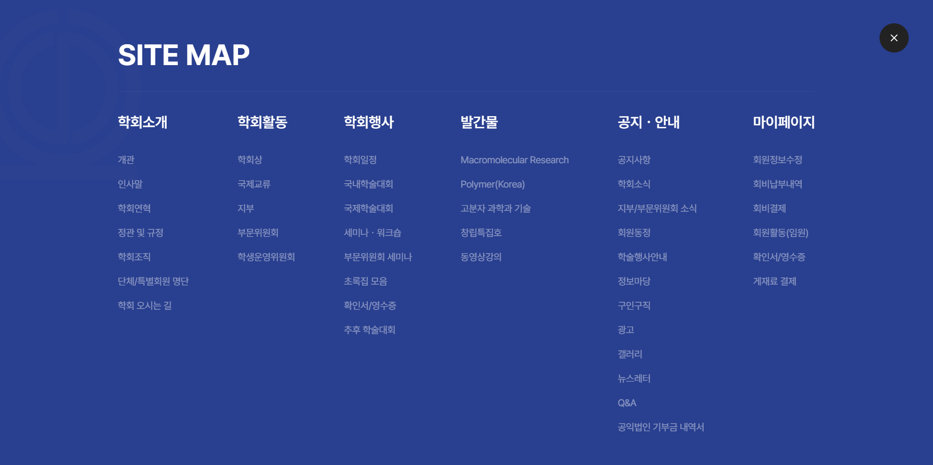 한국고분자학회는 고분자 화학·물리·공학 분야의 학술 발전을 목적으로 하는 사단법인 학술단체로, 국내외 학술대회·세미나·학술지 발간 등 다양한 활동을 운영하고 있습니다. 기존 홈페이지는 회원 서비스·학술행사·발간물·공지 등 방대한 기능이 분산되어 있어 회원들이 필요한 정보를 찾거나 회비결제·게재료 납부 등 업무를 처리하기 불편한 구조였습니다.