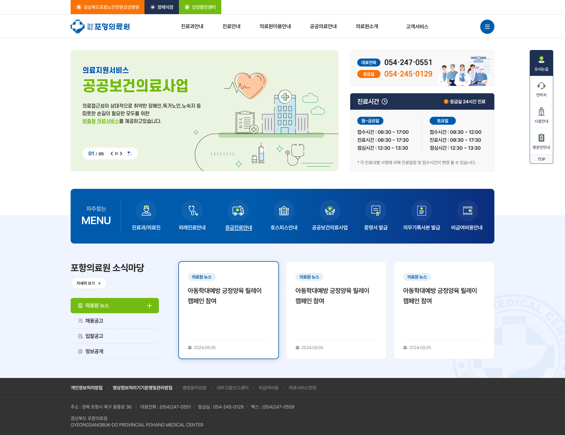 포항의료원 홈페이지는 단순하고 딱딱한 병원의 이미지를 탈피하여, 따뜻하고 친근한 인상을 전달하는 데 중점을 두었습니다. 이를 위해 부드러운 일러스트 요소와 포인트 컬러를 적절히 조화롭게 배치하여 시각적으로 편안한 분위기를 연출하였습니다.