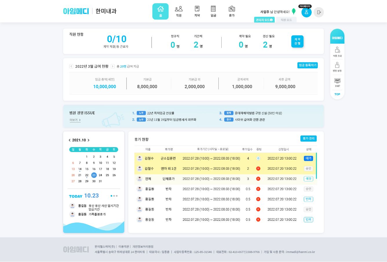 관리자 모드에서 급여 현황 및 직원의 휴가 현황, 병원 공지사항 등을 관리할 수 있습니다.