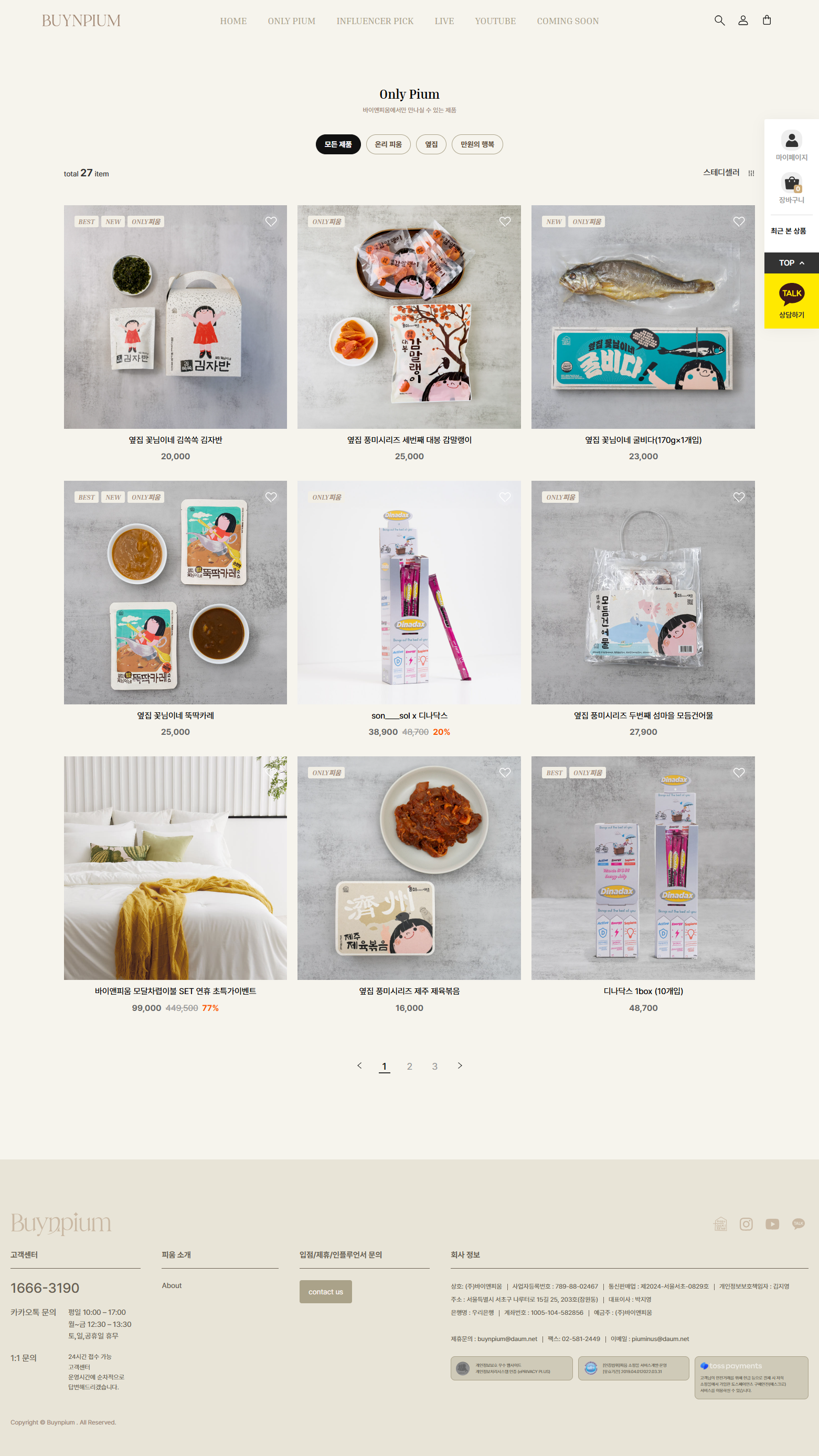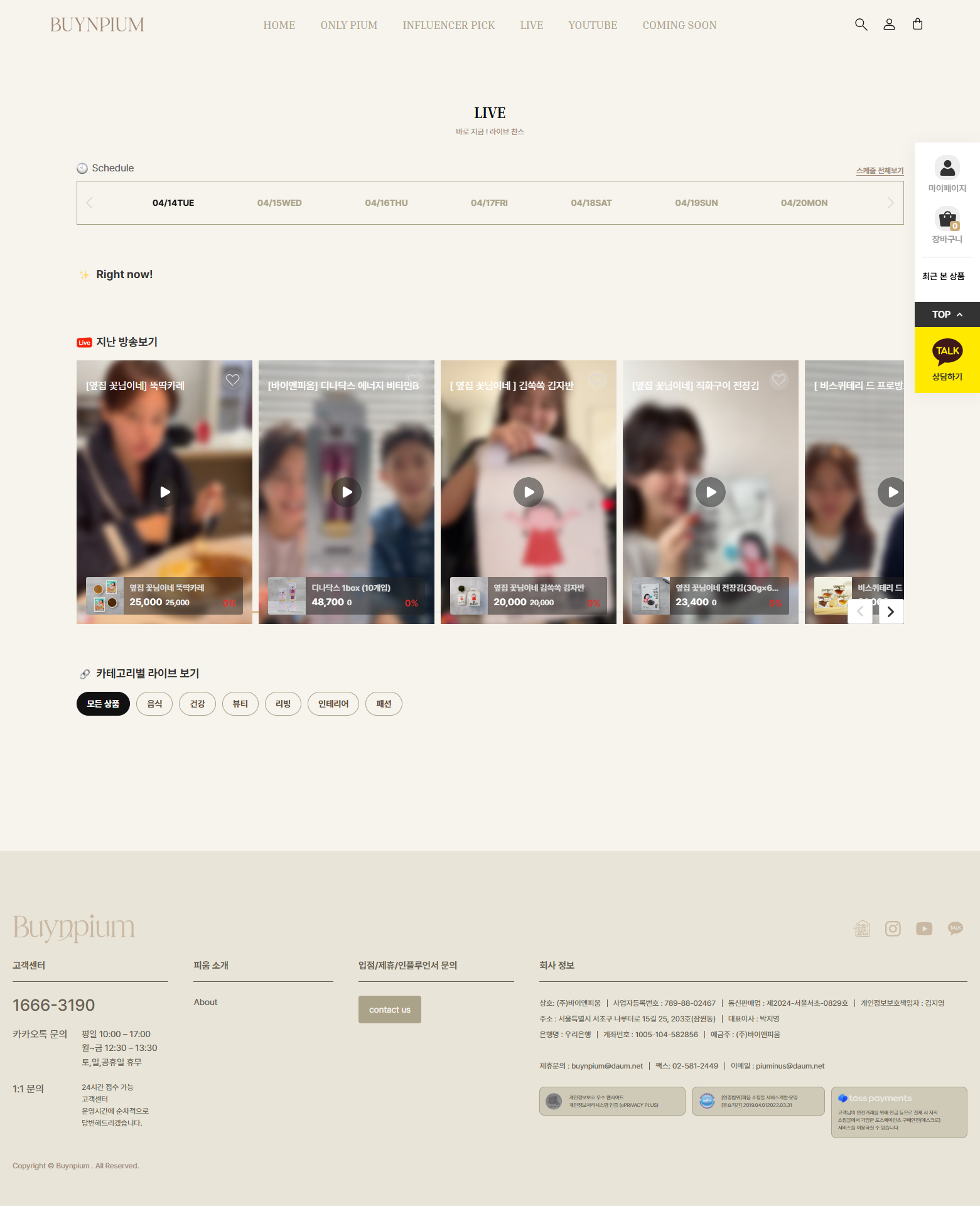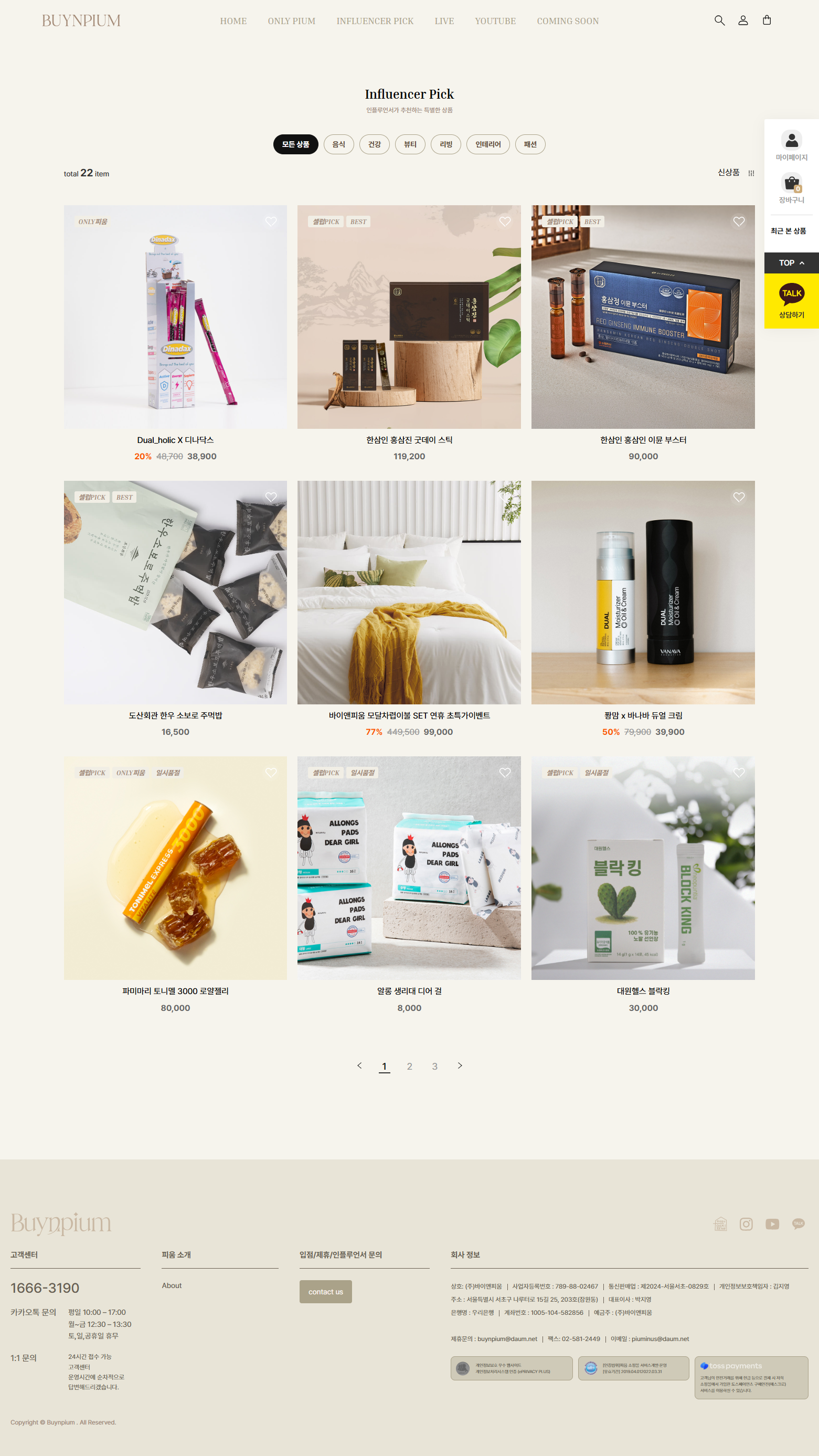 바이앤피움은 인플루언서 콜라보 상품과 라이브커머스를 중심으로 음식·건강·뷰티·리빙·패션 카테고리의 큐레이션 상품을 판매하는 D2C 쇼핑몰로, '옆집 꽃님이네'·'힙꾸미'·'디나닥스' 등 자체 브랜드와 다수 인플루언서 콜라보 상품을 운영하고 있습니다.