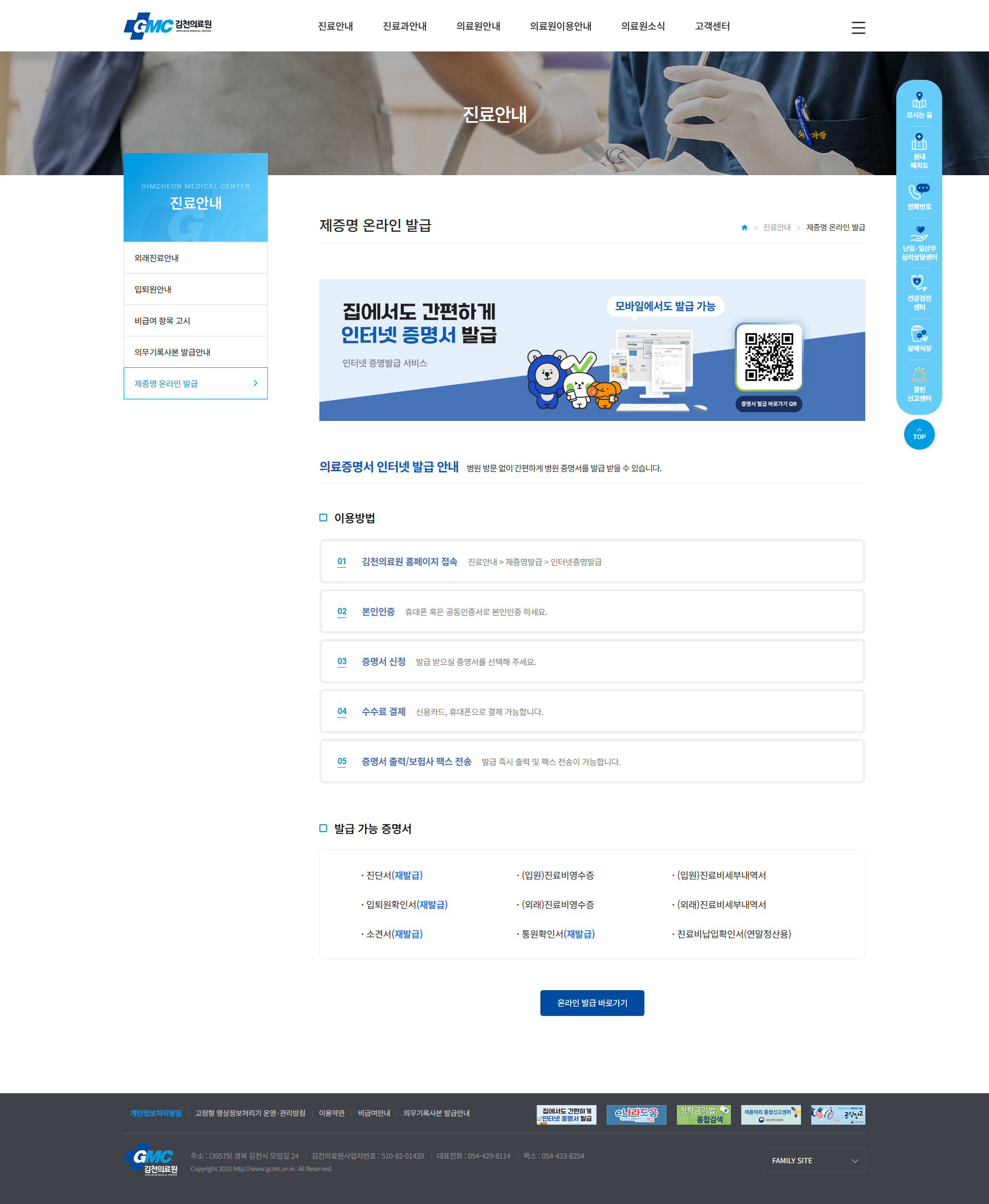 진단서·소견서 등 제증명 서류를 받기 위해 매번 병원을 직접 방문해야 하는 불편이 있었습니다. 외부 증명서 발급 시스템(medcerti)을 웹사이트에 연동하여 휴대폰·공동인증서 본인인증 후 신용카드·휴대폰 결제로 9종 증명서(진단서·입퇴원확인서·소견서·진료비영수증 등)를 온라인 즉시 발급·출력·보험사 팩스 전송까지 처리할 수 있도록 하였습니다. 불필요한 내원을 줄이고 원무 창구 업무 부담을 경감하는 효과를 실현하였습니다.