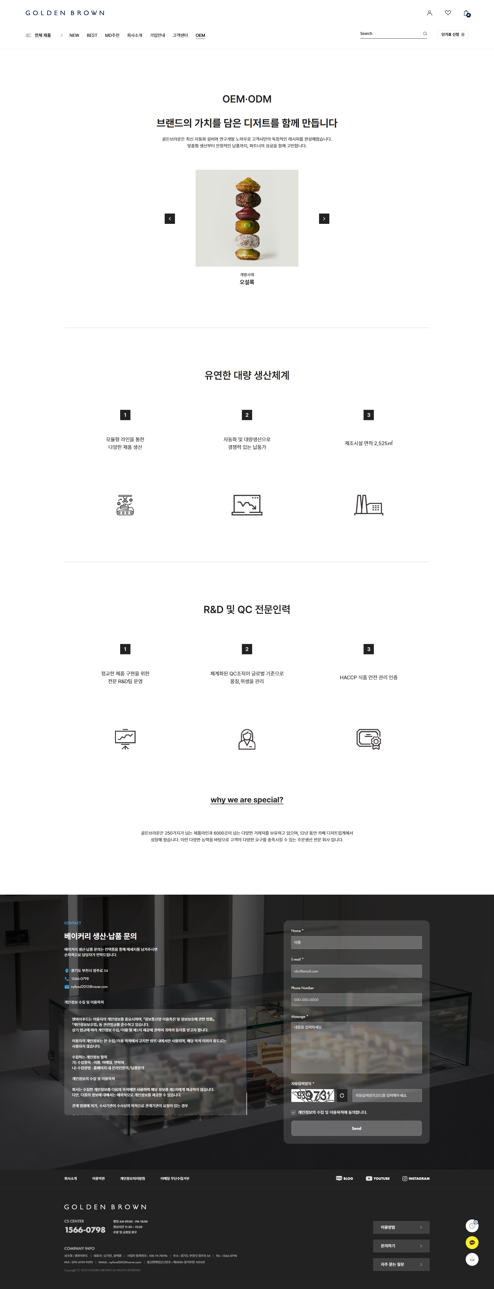 OEM 전용 메뉴, 1:1 문의, 공지사항(배송·단가 변경 안내), 인스타그램·유튜브·블로그 SNS 채널을 하나의 플랫폼에 통합하여 제품 납품부터 PB 제작까지 커버하고 구매 전후 브랜드 신뢰도를 함께 높였습니다.