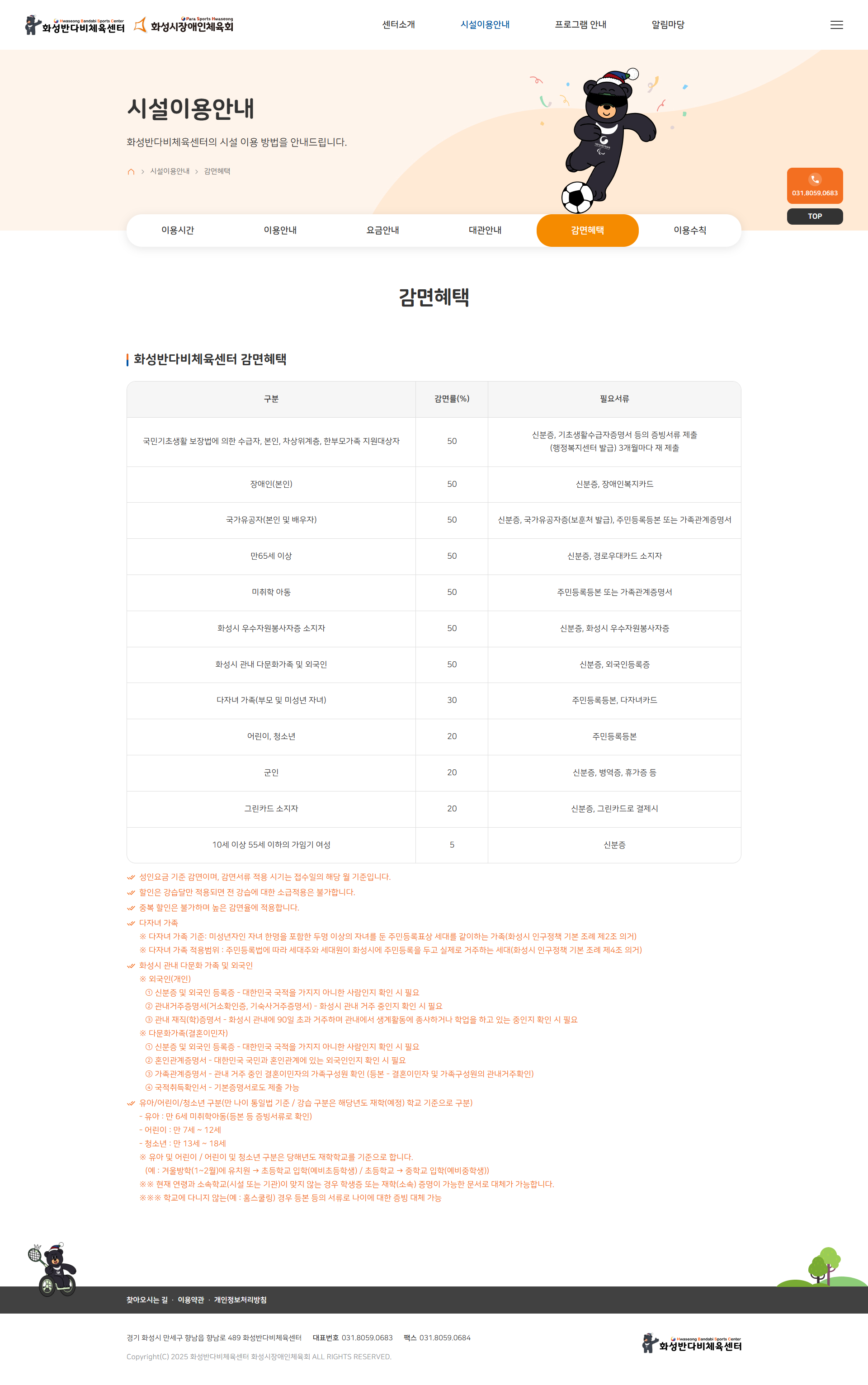감면혜택을 시설이용안내 내 독립 메뉴로 분리하여 장애 등급별 요금 감면 기준을 명확히 안내하고, 대관안내도 별도 제공하여 단체·개인 이용자 모두의 편의를 높였습니다. -