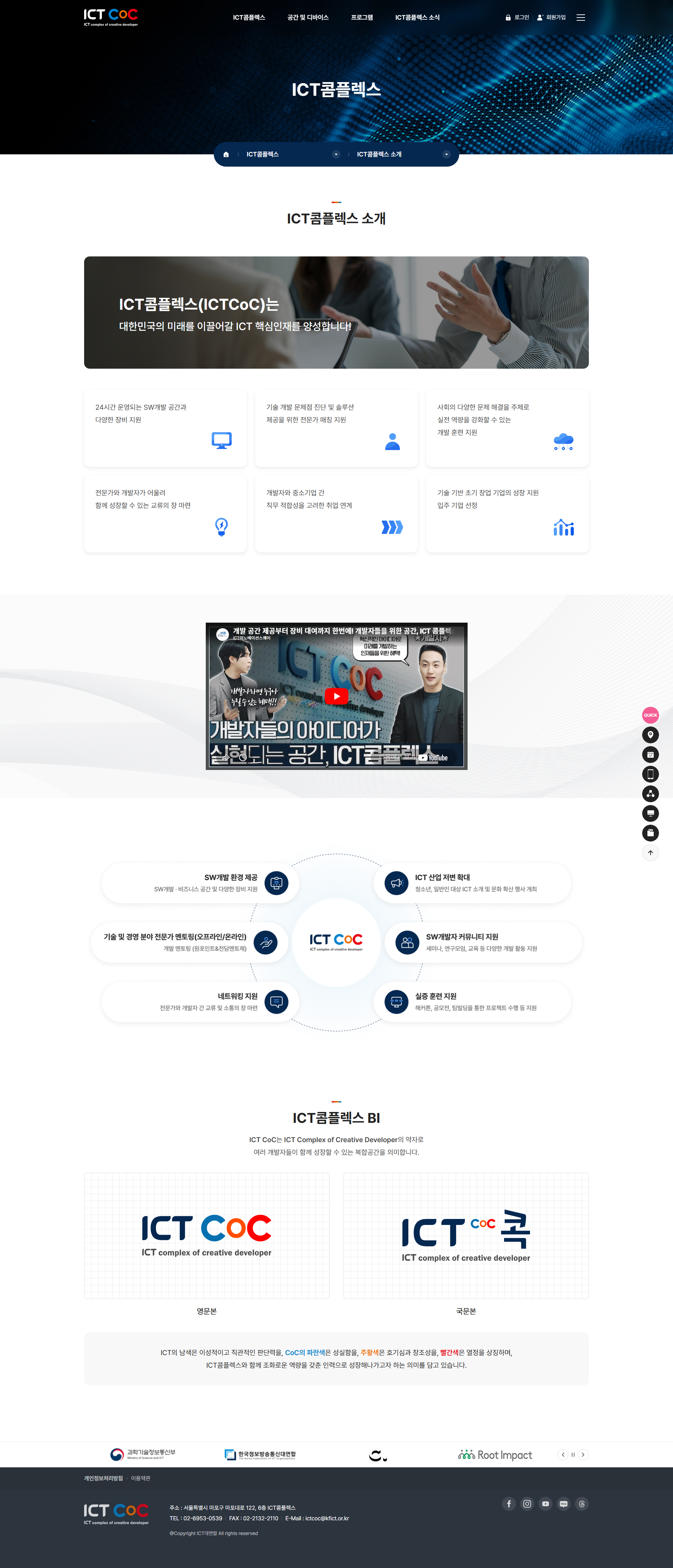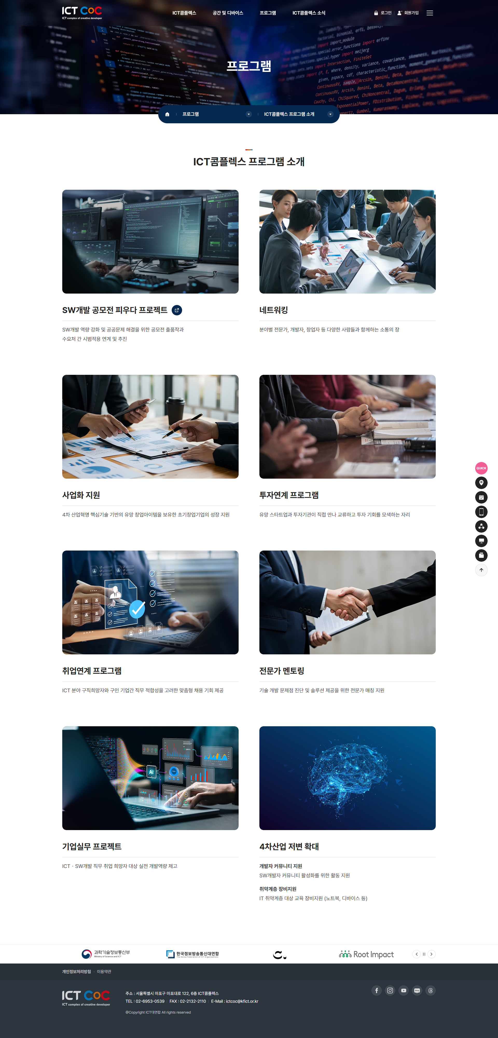 전문가 멘토링, SW개발 공모전, 투자상담회, 콕잡(취업 구인·구직 연계) 등 다양한 프로그램을 온라인으로 신청·관리할 수 있으며, 입주기업 소개·이용가이드·유관기관 소식까지 포괄하는 ICT 창업 생태계 통합 포털로 완성되었습니다.