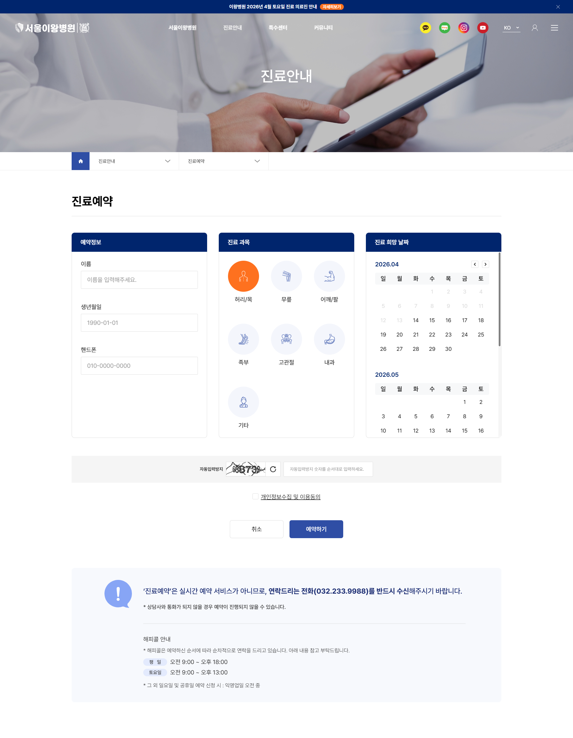 진료과목별 온라인 예약 + 캘린더 날짜 선택