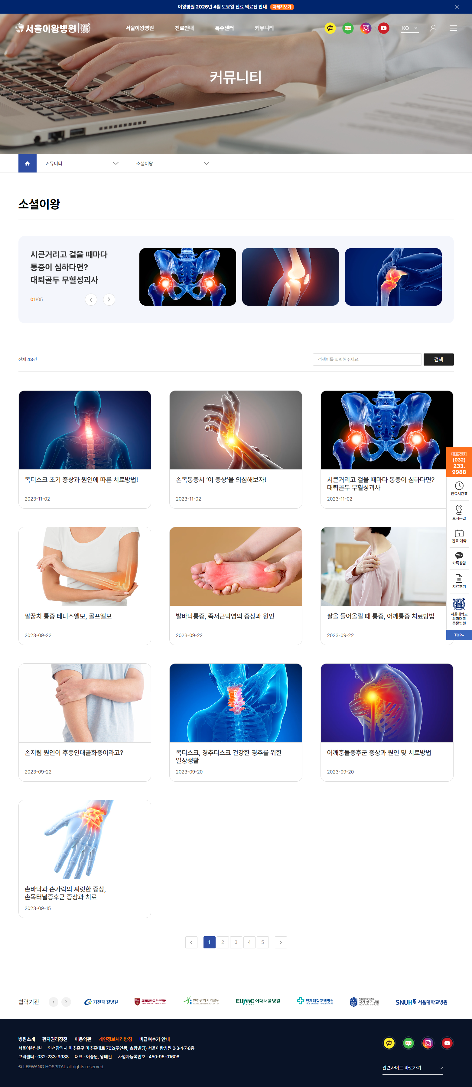 소셜이왕 전용 메뉴로 4개 SNS 채널을 통합 안내하고, 커뮤니티 섹션에 치료후기·고객의소리·언론 및 학술활동을 함께 구성하여 온라인 신뢰 자산을 홈페이지 내에서 순환 소비할 수 있도록 하였습니다.