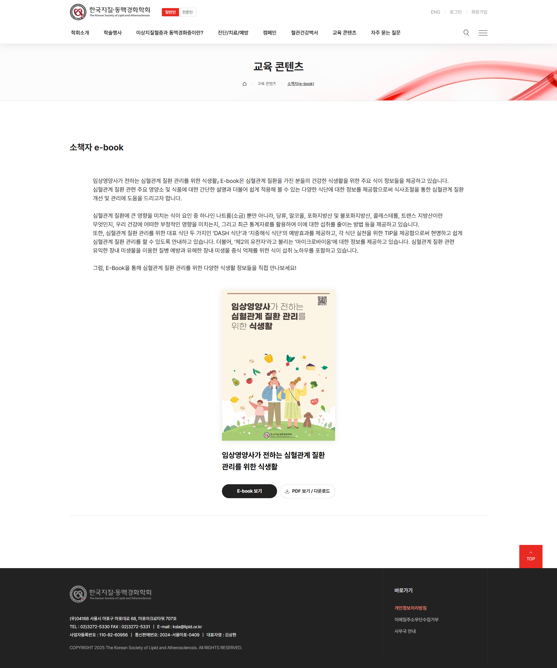 교육 콘텐츠 메뉴에 애니메이션·소책자(e-book)·데이터북·유튜브채널(혈관건강지킴이)을 통합하고, 콜레스테롤의 날 캠페인·자주 묻는 질문·네이버 지식백과 연동 혈관건강백서로 일반인의 지속적인 건강 교육 접근성을 강화하였습니다.