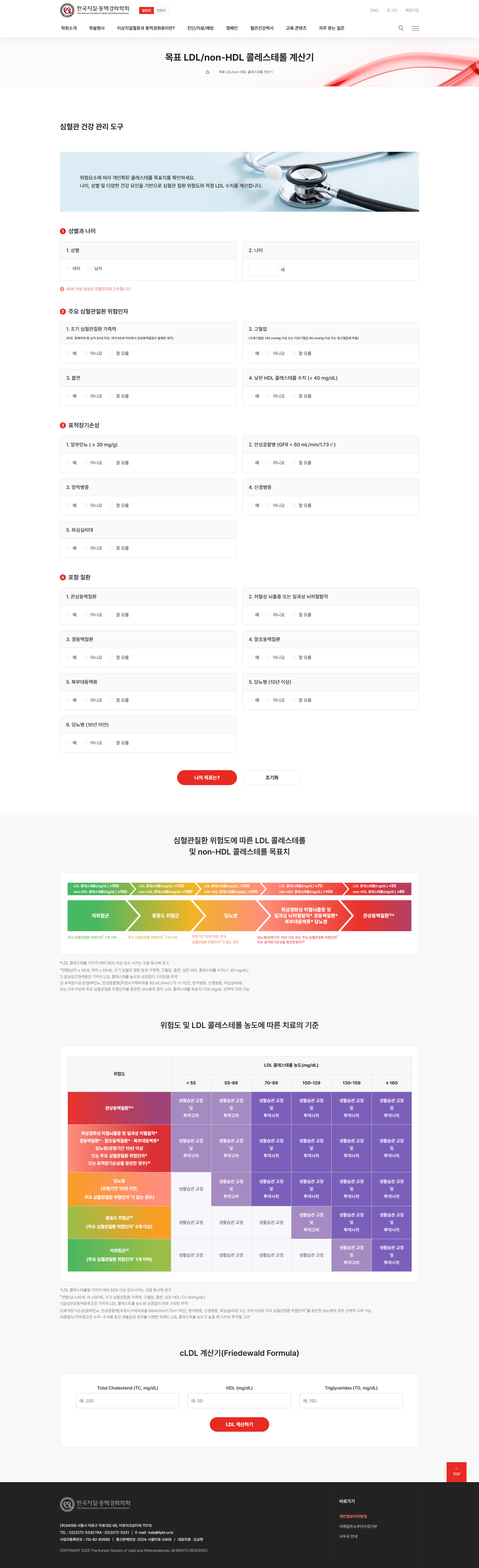 성별·나이·고혈압·당뇨·가족력 등 주요 심혈관질환 위험인자를 입력하면 개인화된 목표 LDL-C 및 non-HDL-C 수치를 자동 산출하는 계산기를 구축하여 임상 현장과 환자 자가 관리의 실용성을 높였습니다. -