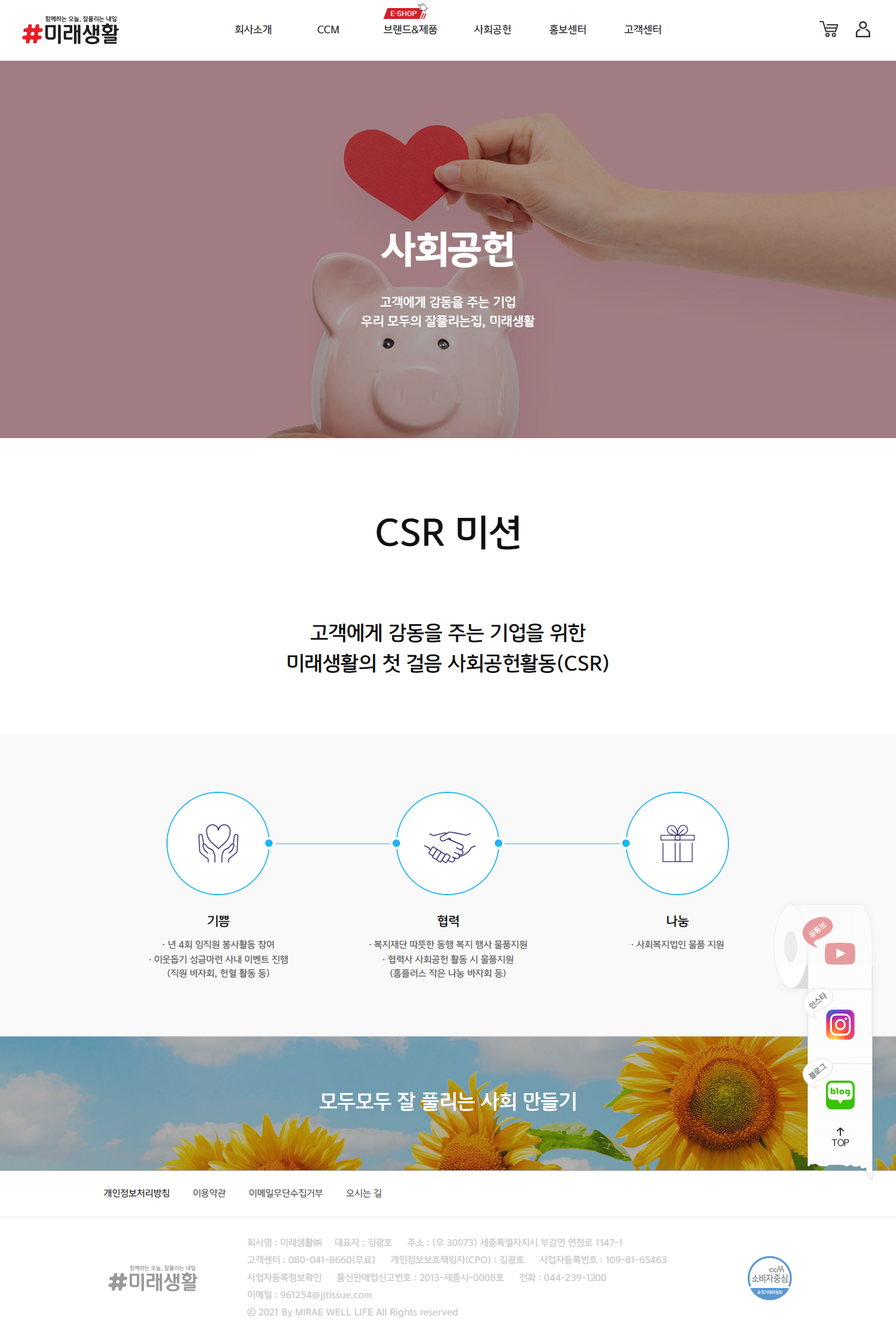 임직원 봉사단 활동·CSR 미션 등 사회공헌 활동이 홈페이지에 체계적으로 정리되지 않아 기업의 사회적 책임 이행 현황이 소비자에게 전달되지 않고, 친환경 브랜드 '나무야나무야'의 지구 살리기 메시지와 연계가 부족하였습니다.