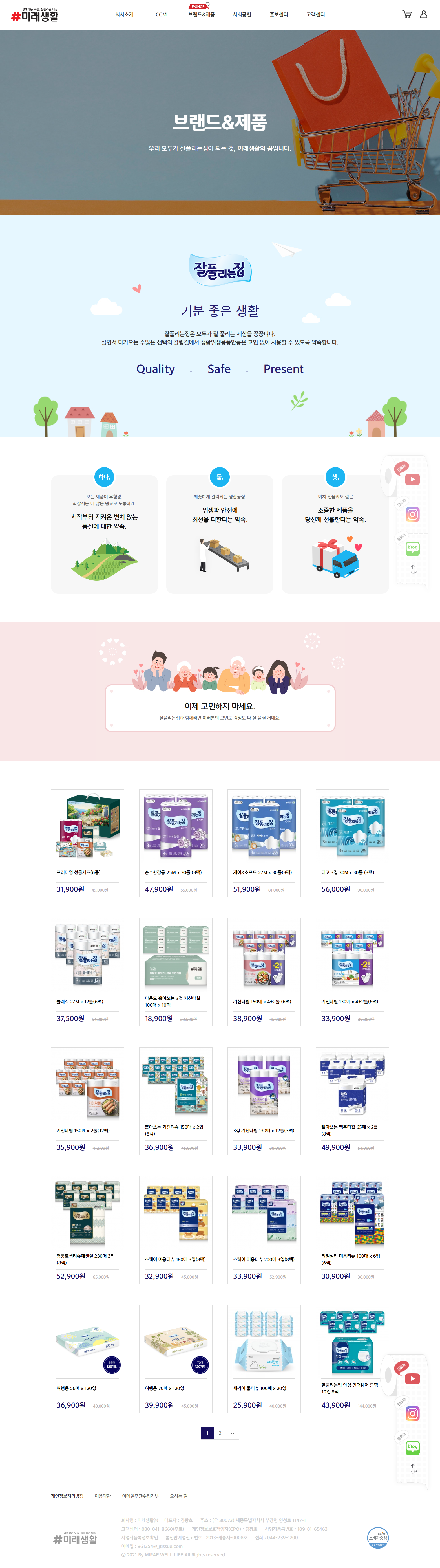 미래생활㈜는 종합위생용품 전문 제조기업으로, 15년 스테디셀러 화장지 브랜드 '잘풀리는집'을 필두로 친환경 화장지 '나무야나무야', 천연흡수체 여성위생용품 '헤이즈', 프리미엄 아기 물티슈 '네이즈', 편안함과 스타일을 더한 '르웨이'의 5개 브랜드를 운영하고 있습니다. 제조사 직영 쇼핑몰 특성상 5개 브랜드의 제품 탐색·구매 동선과 회사의 CCM(소비자중심경영) 인증·CSR 활동·제조 역량을 하나의 플랫폼에서 통합 제공해야 했으며, 콘텐츠 마케팅 채널 역할도 함께 수행해야 하였습니다. 브랜드별 독립 쇼핑 섹션과 CCM·사회공헌·홍보센터·생활백서 콘텐츠를 통합한 종합 브랜드 쇼핑몰을 구축하였습니다.
