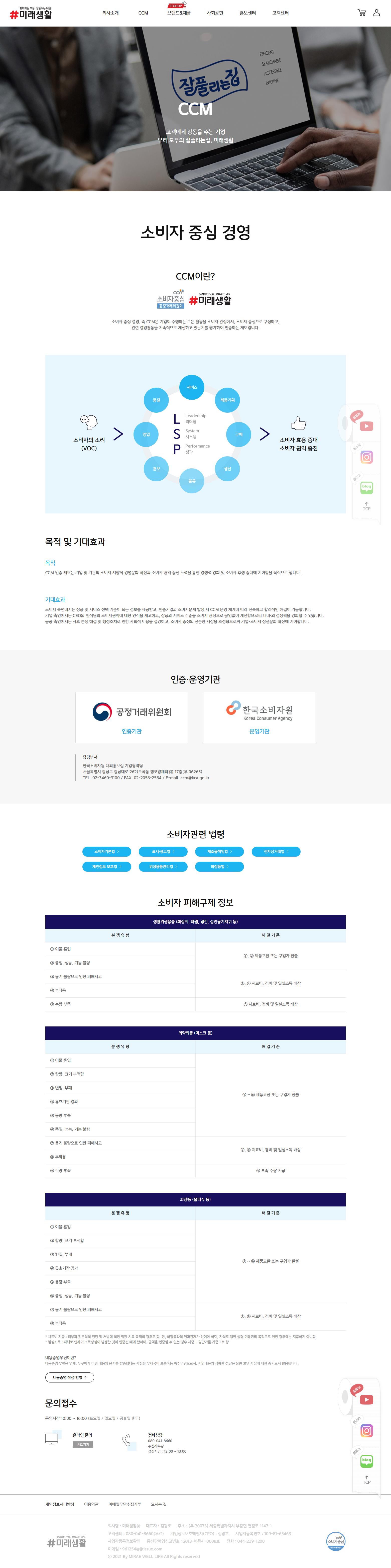 CCM을 독립 대메뉴로 구성하고 소비자중심경영 내용과 윤리헌장을 별도 페이지로 분리하여 미래생활의 소비자 신뢰 경영 철학을 명확히 전달하고 공정거래위원회 인증 브랜드로서의 신뢰도를 강화하였습니다. -