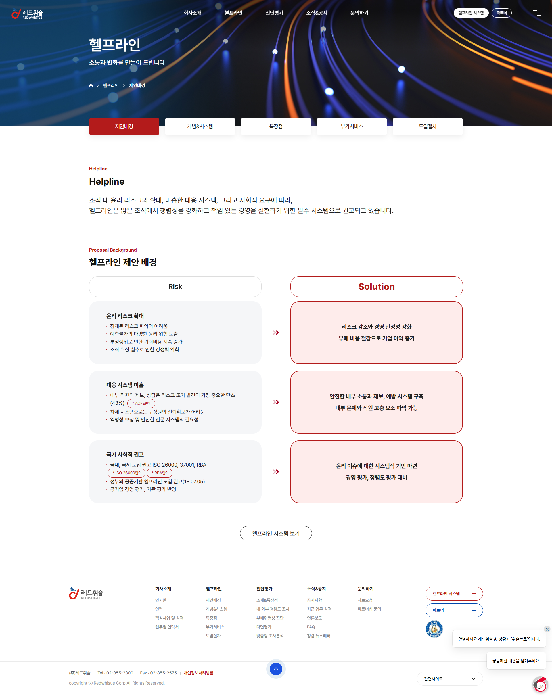 (주)레드휘슬은 국내 최초로 컴플라이언스 전문 서비스를 시작한 기업으로, 조직의 청렴성 유지를 위한 윤리경영 시스템 '헬프라인'과 내·외부 청렴도 조사·부패위험성 진단·다면평가·맞춤형 조사분석의 '진단평가'의 2대 핵심 서비스를 운영하고 있습니다. 헬프라인의 익명성 보장·보안성·13년 운영 신뢰도와 진단평가의 전문성이 기존 홈페이지에서 명확히 전달되지 않았고, 잠재 고객의 문의·자료요청·파트너십 연결 채널이 분산되어 있었습니다.