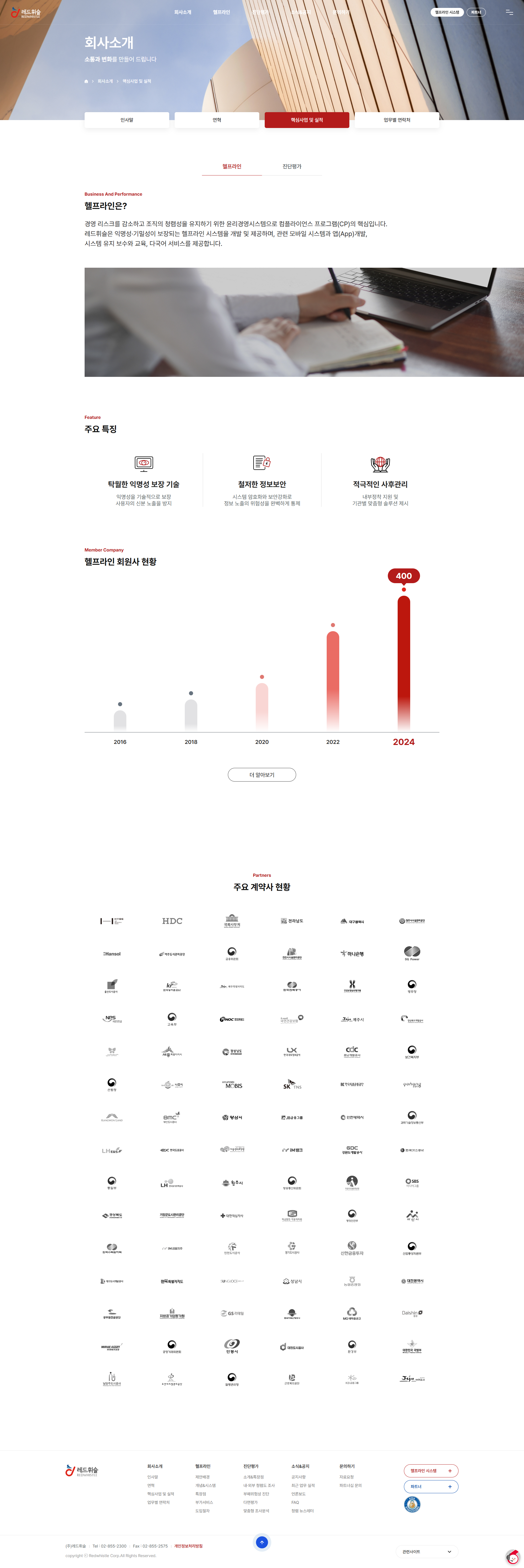 최초 서비스 시작 2012년·헬프라인 회원사 ·평가 수행실적이 텍스트로만 표현되어 레드휘슬의 시장 지위와 신뢰도가 방문자에게 즉각적으로 체감되지 않았고, 실제 고객 후기가 노출되지 않아 도입 결정에 필요한 사회적 증거가 부족하였습니다.