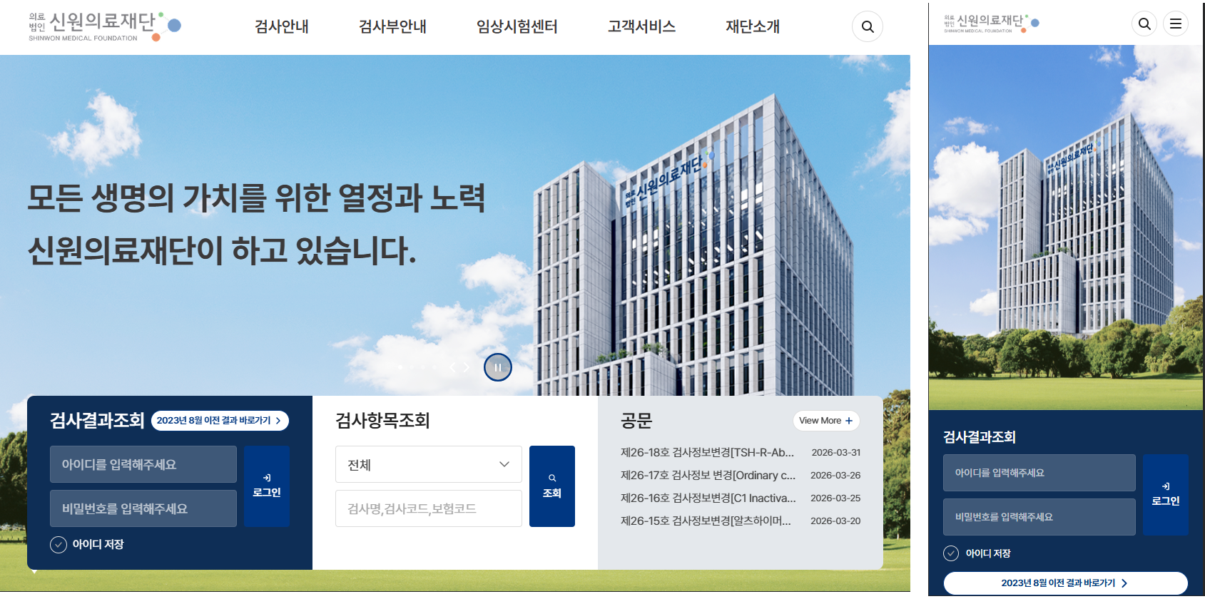 - 키워드 하나로 검사항목, 검체 용기, 공지사항 등 사이트 내 다양한 콘텐츠를 한 번에 탐색 가능