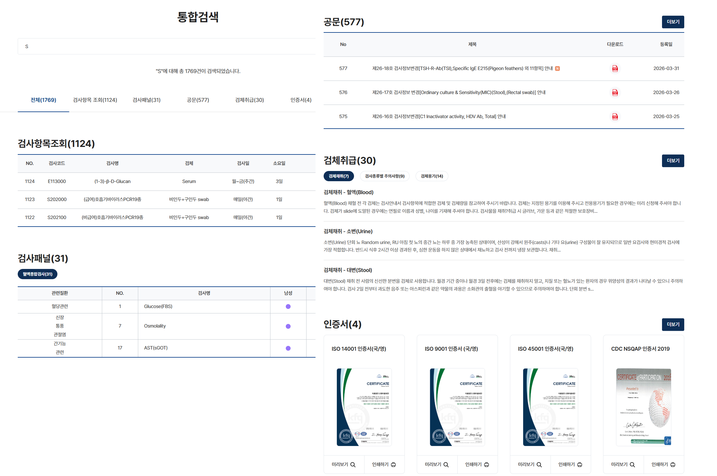 검사항목·검체 용기·공지사항 등 전 콘텐츠를 아우르는 통합검색 기능 구현