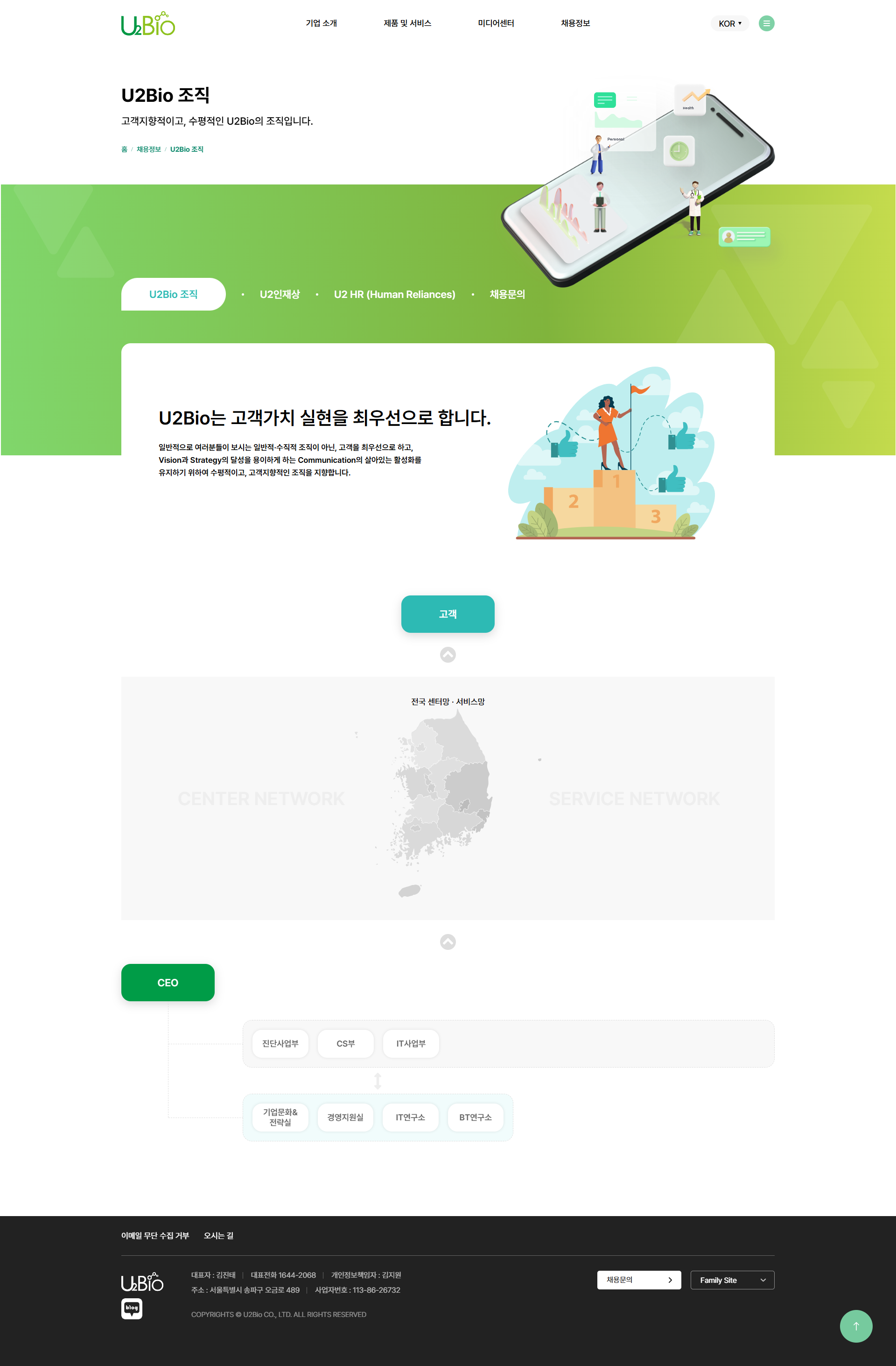 U2Bio IT·U2Cloud·U2Labs(의료재단)·지구홀딩스 등 계열사 및 관련 기관이 독립적으로 운영되어 그룹 전체의 규모와 역량이 외부에 충분히 전달되지 못했습니다. 패밀리 사이트 링크 구역을 통해 IT·클라우드·의료재단·지주회사까지 하나의 브랜드 생태계로 묶어 제시함으로써, 투자자와 파트너사에게 그룹의 실질적 역량과 확장성을 효과적으로 전달하였습니다.