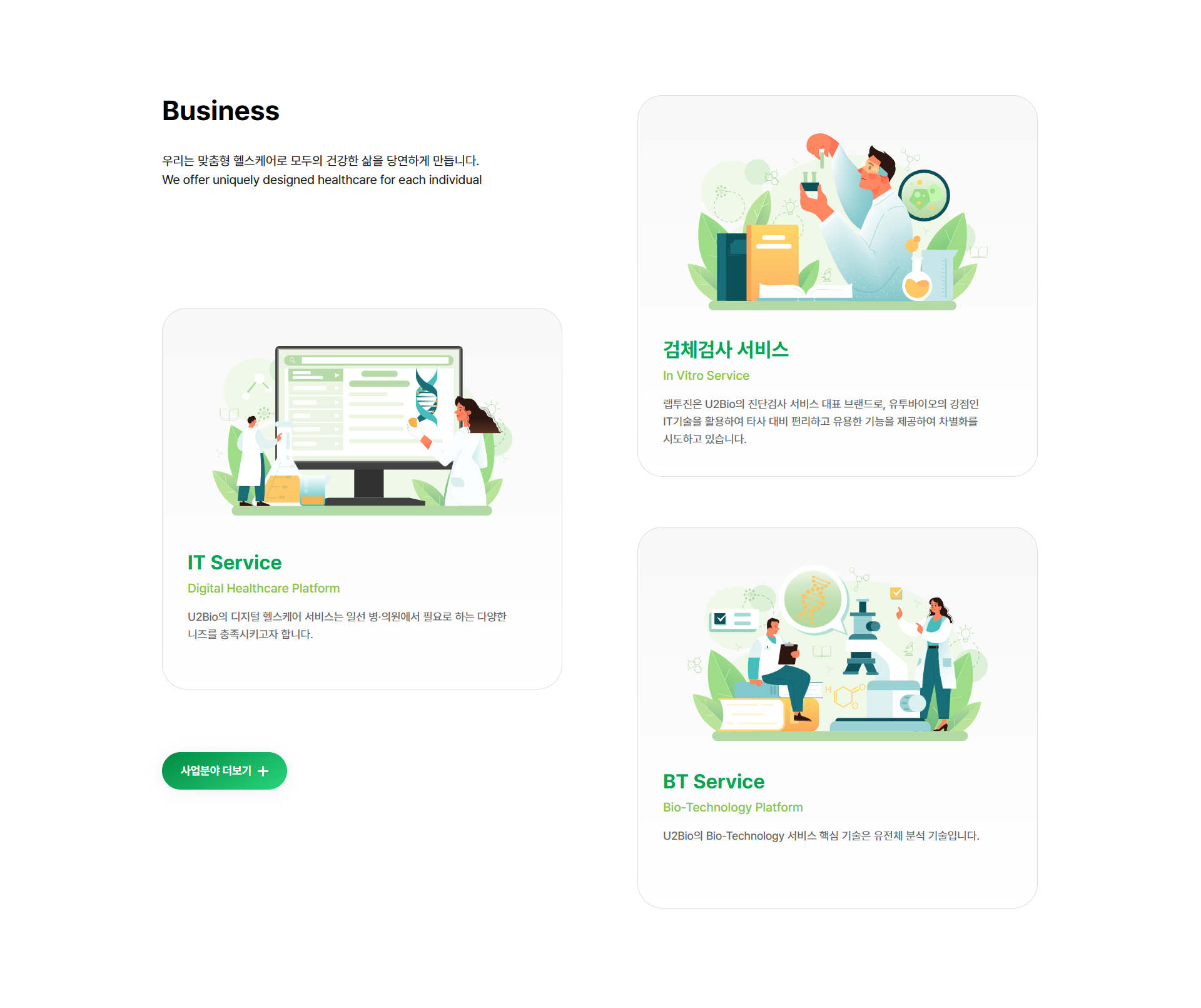 디지털 헬스케어(IT), 검체검사(In Vitro Service), 바이오테크놀로지(BT)의 세 가지 사업 영역은 성격이 달라 단일 사이트에서 통일감 있게 표현하기 어렵고 방문자가 원하는 정보를 찾기 어려웠습니다. 메인 비주얼에서 3개 사업을 병렬로 제시하고 각 사업별 전용 서비스 페이지로 연결하는 직관적 정보 구조를 구축하여, 병·의원 파트너·투자자·일반 방문자 모두가 자신의 관심 영역으로 즉시 진입할 수 있도록 하였습니다.