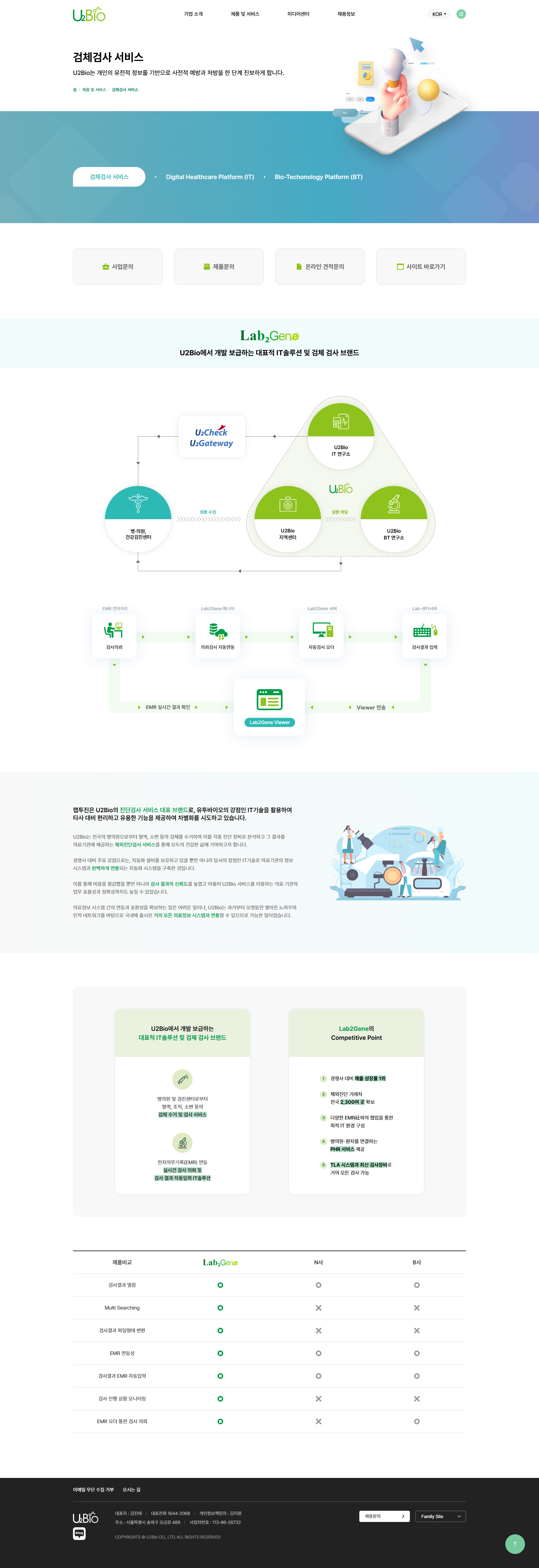 일선 병·의원 대상의 디지털 헬스케어 서비스와 검체검사 서비스(랩투진 브랜드)가 분리된 채널로 운영되어 파트너 병·의원이 U2Bio의 전체 솔루션을 한눈에 파악하기 어려웠습니다. 통합된 '제품 및 서비스' 메뉴 구조와 E카탈로그 다운로드 기능을 제공하여 파트너 병·의원이 U2Bio의 IT·BT 솔루션 전체를 비교 검토하고 도입 의사결정을 내릴 수 있는 B2B 정보 접점을 마련하였습니다.
