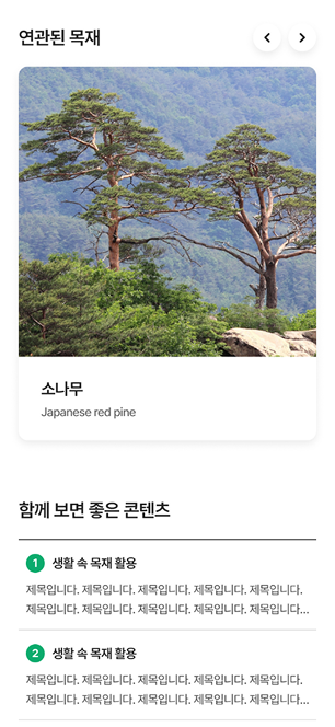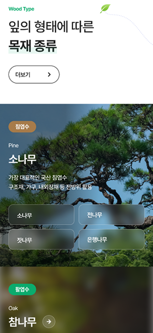 산림을 상징하는 그린과 목재의 브라운 컬러를 모던하게 재해석하여 사용했습니다. 잎의 형태를 형상화한 그래픽 모티프와 부드러운 파스텔 톤의 포인트 컬러를 통해, 국립산림과학원만의 친환경적이고 편안한 사용자 경험(UX)**을 모바일에 최적화하여 담아냈습니다.
