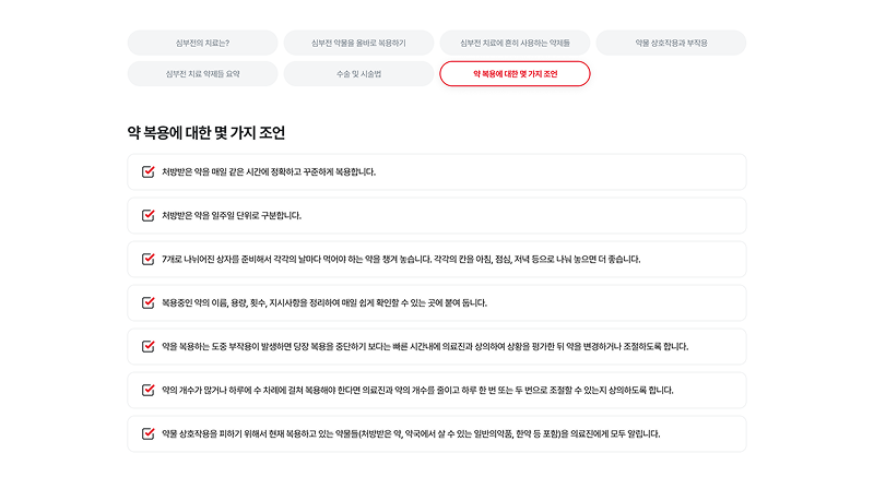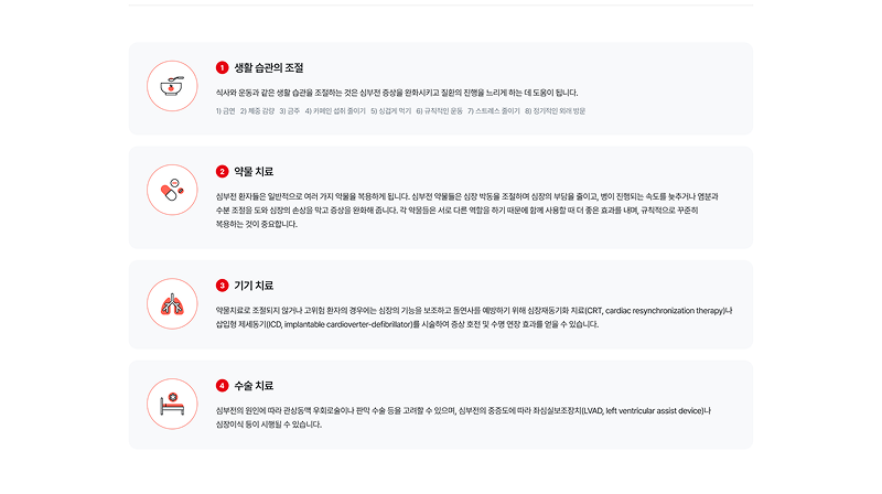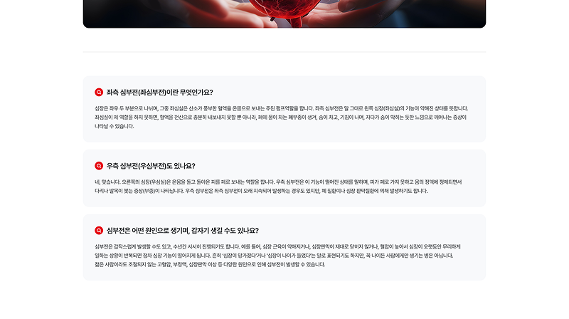 심부전 환자와 가족들에게 필요한 정보를 친근하게 전달하기 위해 부드러운 일러스트와 따뜻한 코랄 레드 톤을 매치하였습니다. 복잡한 의학 정보를 직관적인 카드 타입 레이아웃으로 재구성하여 사용자의 정보 접근성과 심리적 안정감을 동시에 높였습니다.