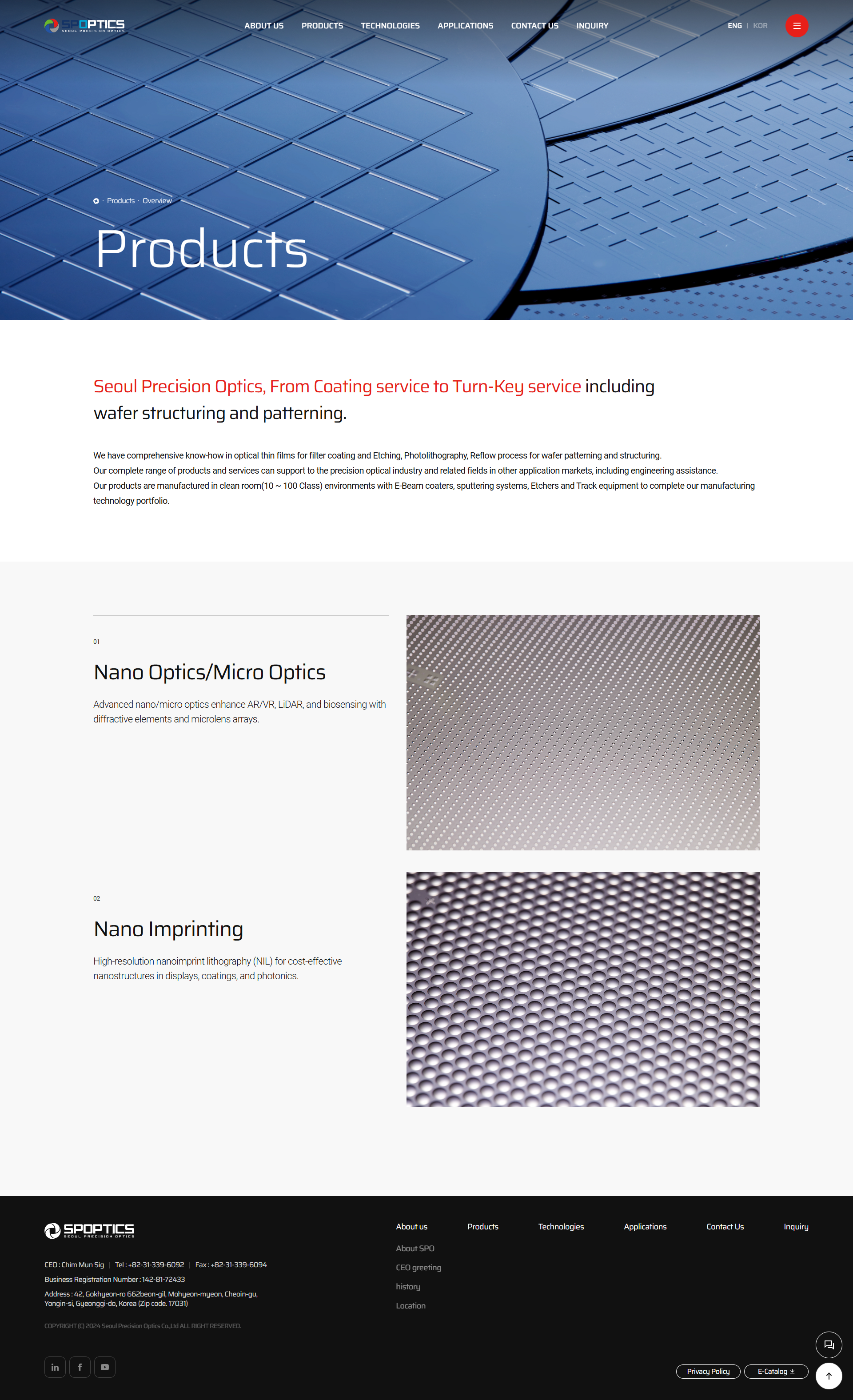 PRODUCTS(나노/마이크로 광학 제품) → TECHNOLOGIES(4대 핵심 공정 기술) → APPLICATIONS(Meta Optics·Photonics·MEMS·Biosensing 적용 분야)의 3단 탐색 구조로 구성하여 해외 바이어가 자사 제품에 맞는 기술과 솔루션을 논리적으로 탐색할 수 있도록 하였습니다. -