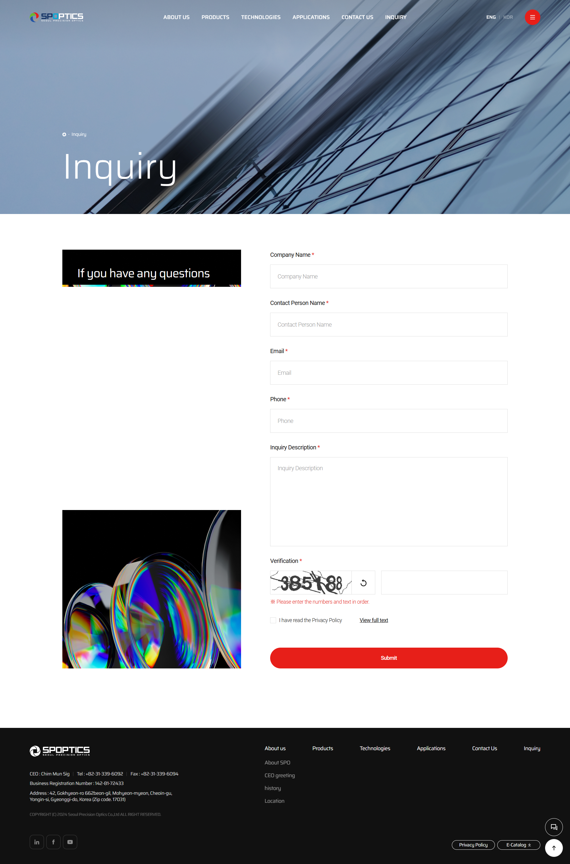 IATF16949·ISO9001·ISO14001 인증을 보유한 글로벌 B2B 기업으로, 해외 고객과 파트너가 기술력과 제품 라인업을 명확히 이해하고 문의로 이어지는 영문 중심의 글로벌 홈페이지가 필요하였습니다. PRODUCTS·TECHNOLOGIES·APPLICATIONS의 3단 구조로 기술 역량을 체계적으로 소개하고 ENG/KOR 이중언어와 INQUIRY 제품문의 기능을 갖춘 글로벌 B2B 기업 홈페이지를 구축하였습니다.