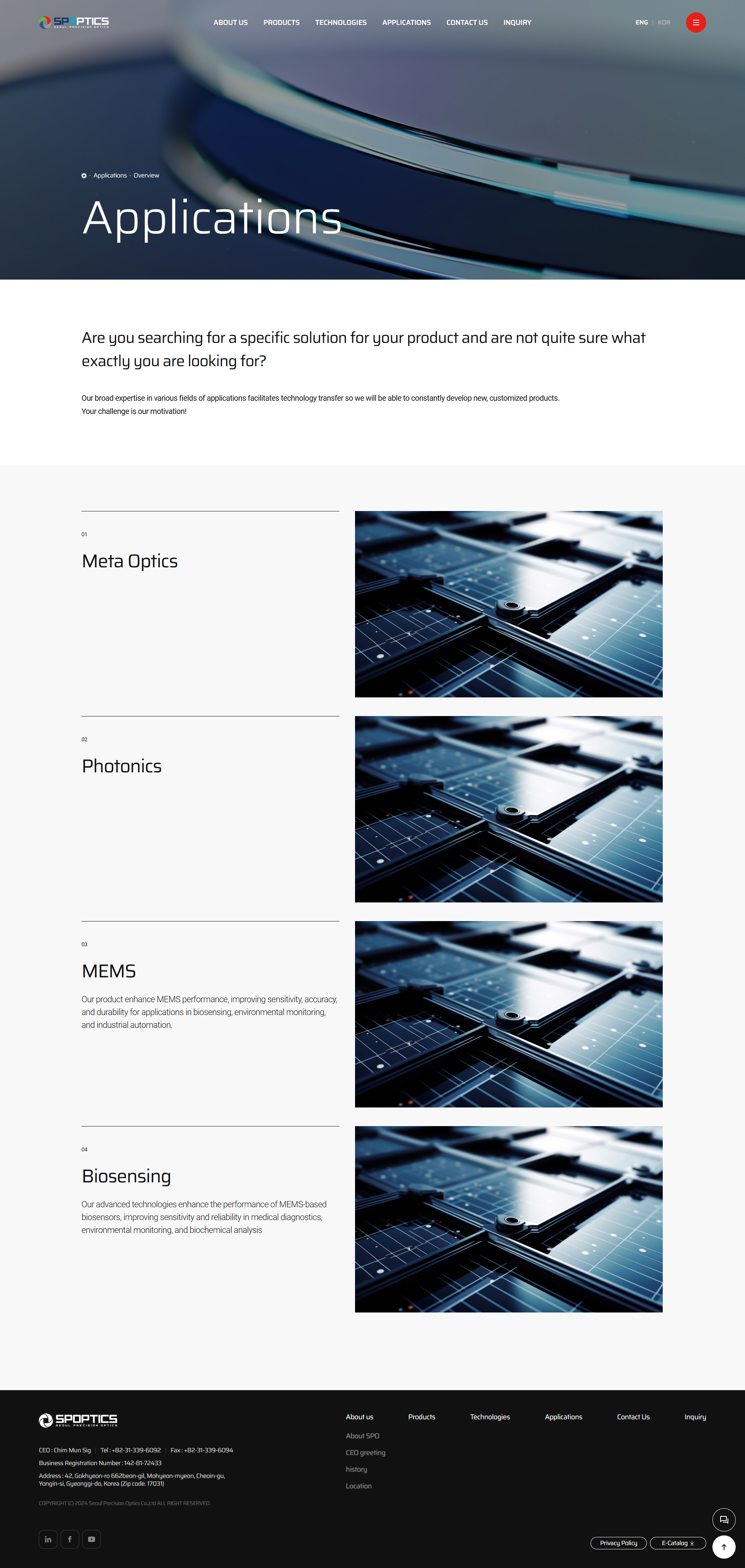 APPLICATIONS 페이지에 Meta Optics·Photonics·MEMS·Biosensing의 4개 응용 분야를 별도 구성하여 각 분야에서의 기술 활용 가능성을 명시하고, 맞춤형 제품 개발 가능성을 강조하는 메시지를 통해 신규 산업 영업 접점을 확대하였습니다. -