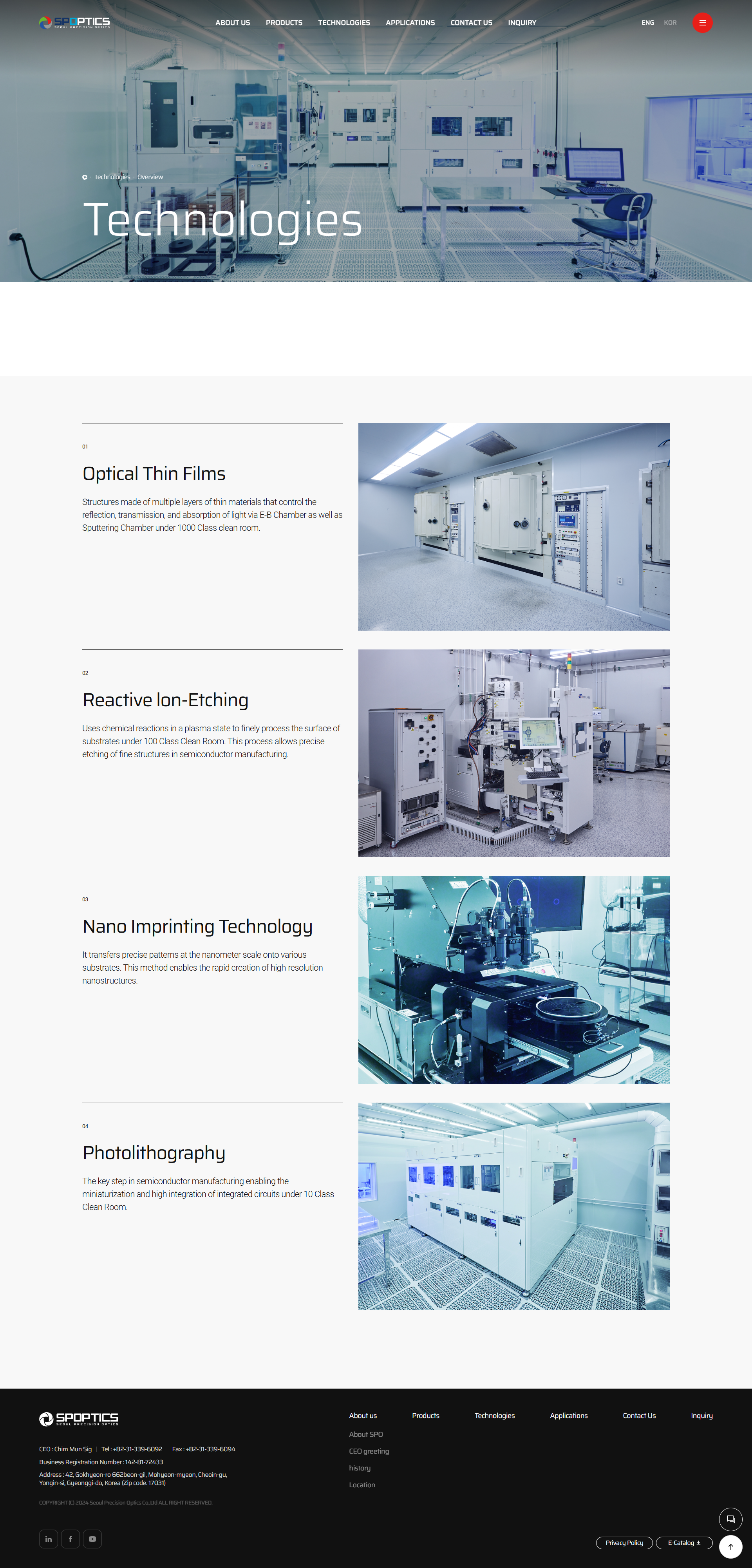1000 Class~10 Class 클린룸 환경의 E-B Chamber·Sputtering Chamber·RIE·나노임프린트 리소그래피(NIL)·포토리소그래피 등 고도의 공정 기술이 체계화 없이 나열되어 기술 수준과 적용 범위를 글로벌 고객에게 효과적으로 전달하기 어려웠습니다. TECHNOLOGIES 페이지에 4대 공정 기술을 번호 순으로 구분하고 각 기술의 클린룸 등급·장비·적용 범위를 영문으로 명확히 설명하여 기술력 신뢰도를 높였습니다.