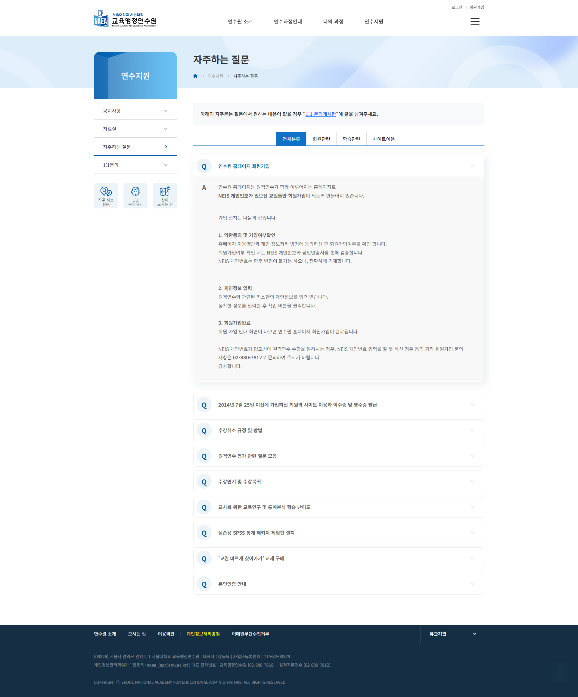 또한 수료 후 증명서 발급을 위한 별도 경로가 없어 행정 처리 부담이 컸습니다. 연수과정 안내·수강신청·나의 강의실·증명서 발급을 하나의 통합 플랫폼으로 구성하고, 연간 연수 일정·자료실·FAQ·1:1 온라인 문의까지 연수지원 허브로 통합하여 교원과 교육행정가가 연수의 전 과정을 온라인에서 완결할 수 있는 서울대학교 교육행정연수원 전용 LMS 플랫폼을 완성하였습니다.