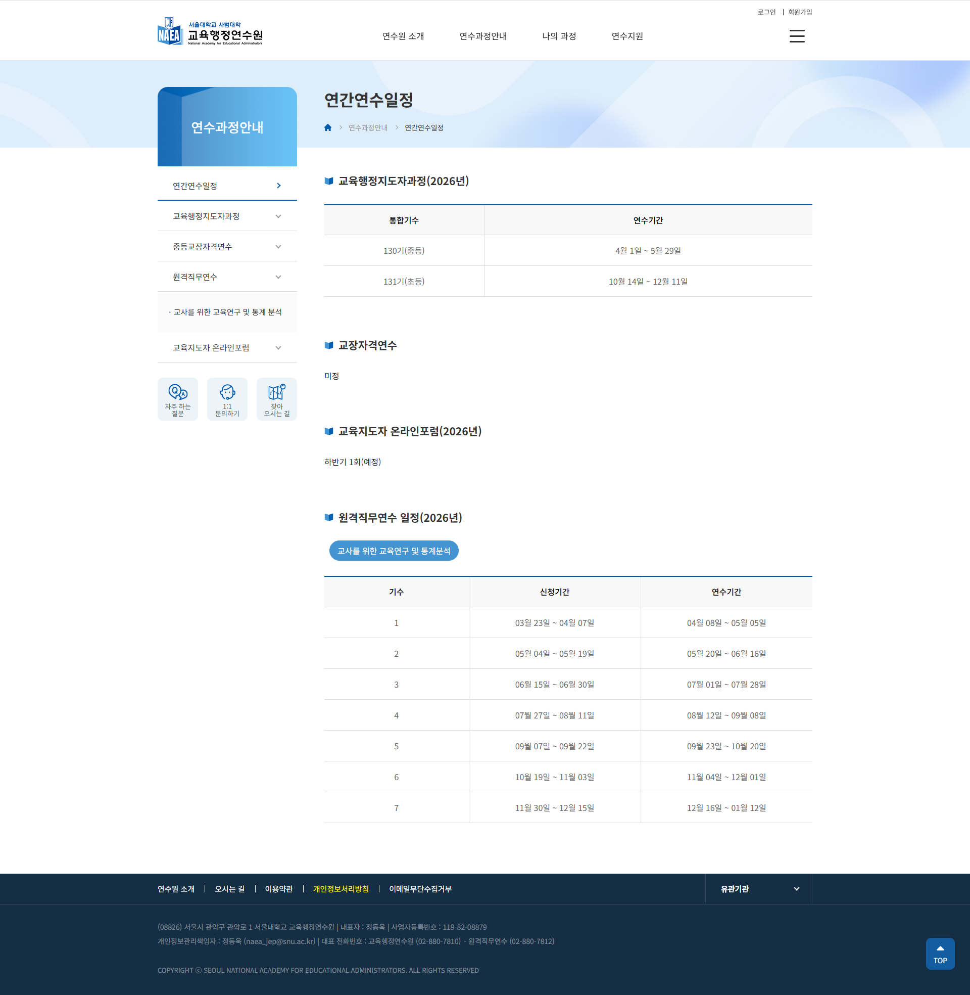 서울대학교 사범대학 교육행정연수원은 교육행정지도자과정·중등교장자격연수·원격직무연수·교육지도자 온라인포럼 4종의 연수 과정을 운영하고 있으나, 과정별 수강신청·일정·학습 관리가 분산되어 있어 연수생이 신청부터 이수까지 일관된 경험을 갖기 어려웠습니다.