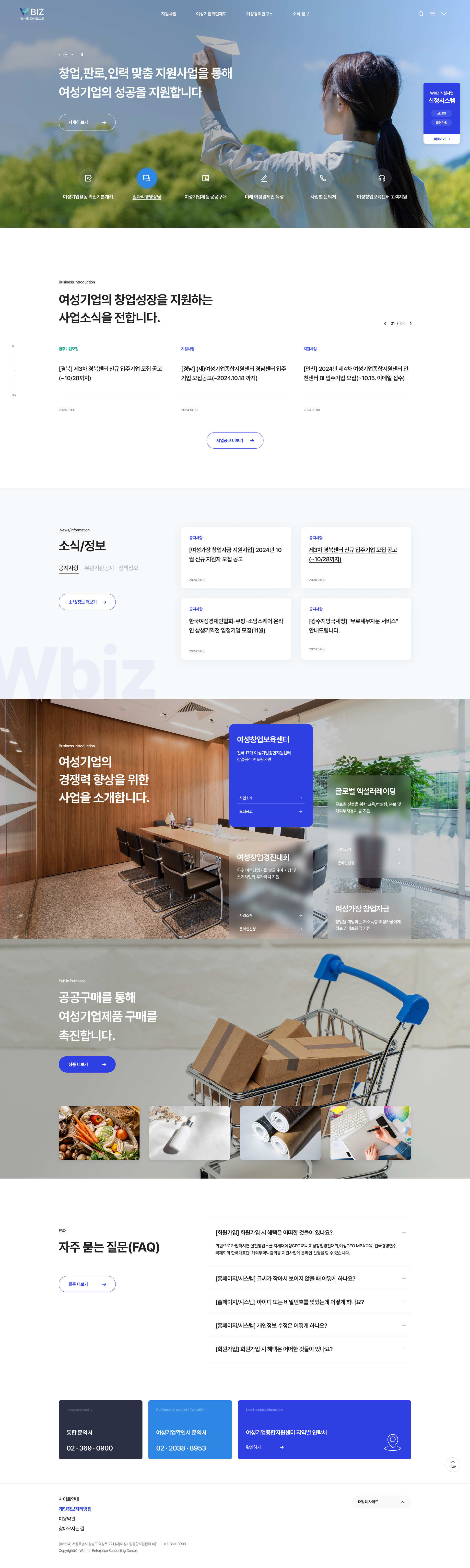 여성기업의 창업과 성장을 지원하는 플랫폼으로, 신뢰감과 정보 접근성을 중심으로 설계된 디자인입니다.