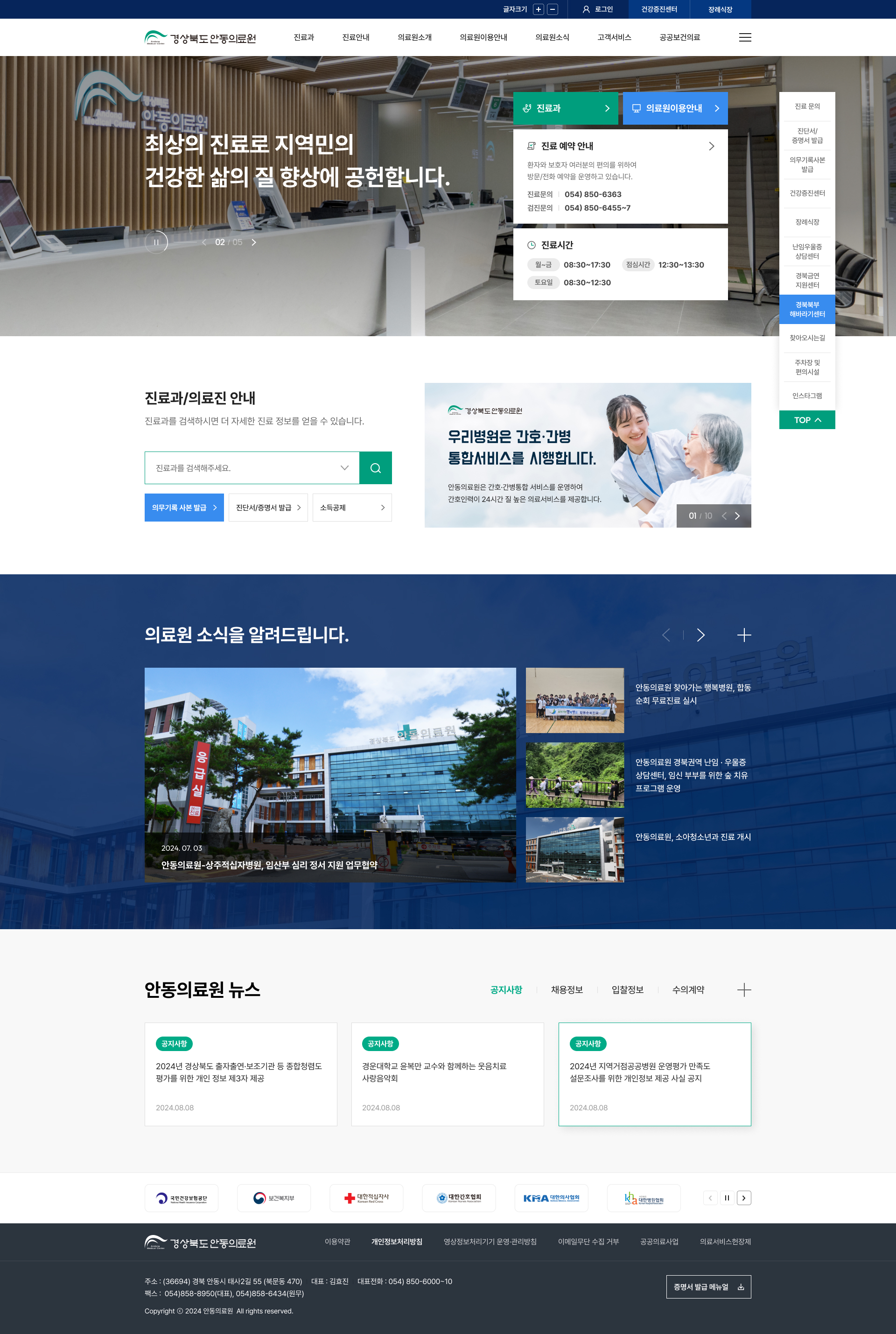 안동의료원은 주요 사용자층에 맞춰 간결하고 정돈된 레이아웃으로 구성되어, 정보 접근성을 높였습니다.