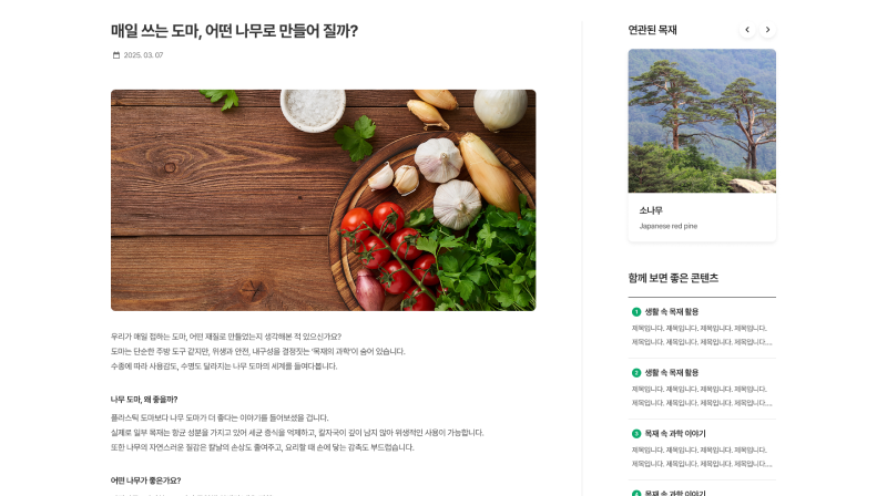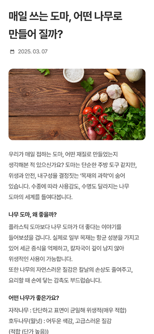 목재는 인류와 함께한 가장 오래된 자원입니다. 가볍고 강하며, 가공이 쉬워 대형 건축물부터 생활용품까지 우리 삶 곳곳에 활용되어 왔습니다.