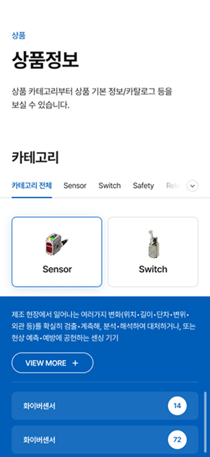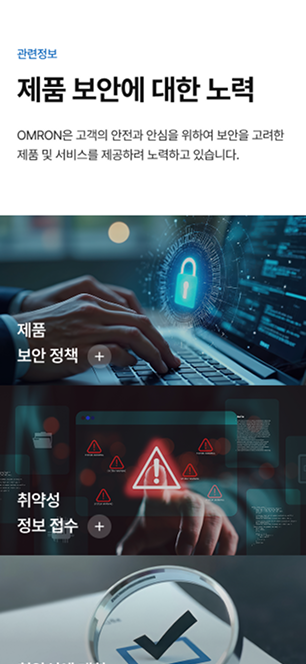 오므론은 자사의 핵심역량을 바탕으로, 생산성 향상을 추구하는 제조 현장을 지원합니다. FA(Factory Automation)용 콘트롤러에서부터, 센서, 스위치, 릴레이, 세이프티 기기까지 무려 10만 종이 넘는 다양한 사양의 제품을 제공하며, 산업현장에서 요구되는 고품질과 안전성에 대한 기대에 걸맞는 서비스를 제공하고 있습니다.